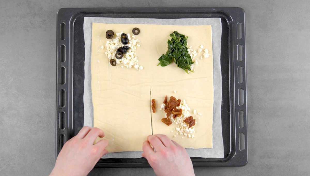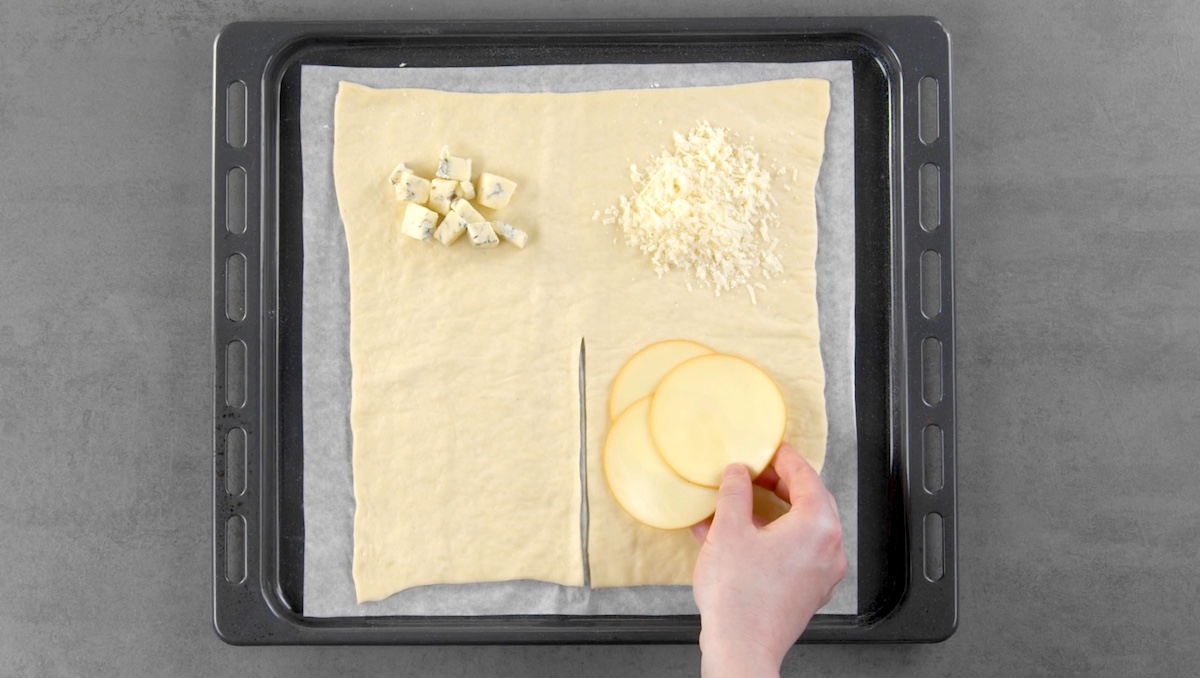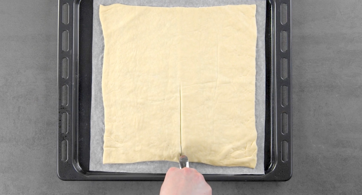 1. Schneide einen quadratischen Pizzateig (30 x 30 cm) von einer Seitenmitte bis zur Teigmitte hin ein.