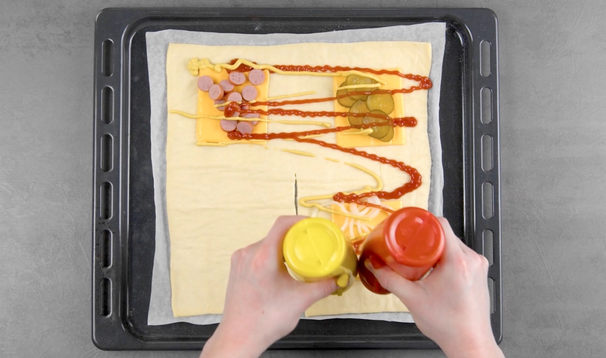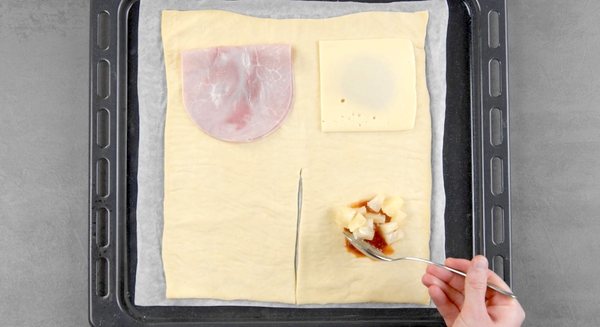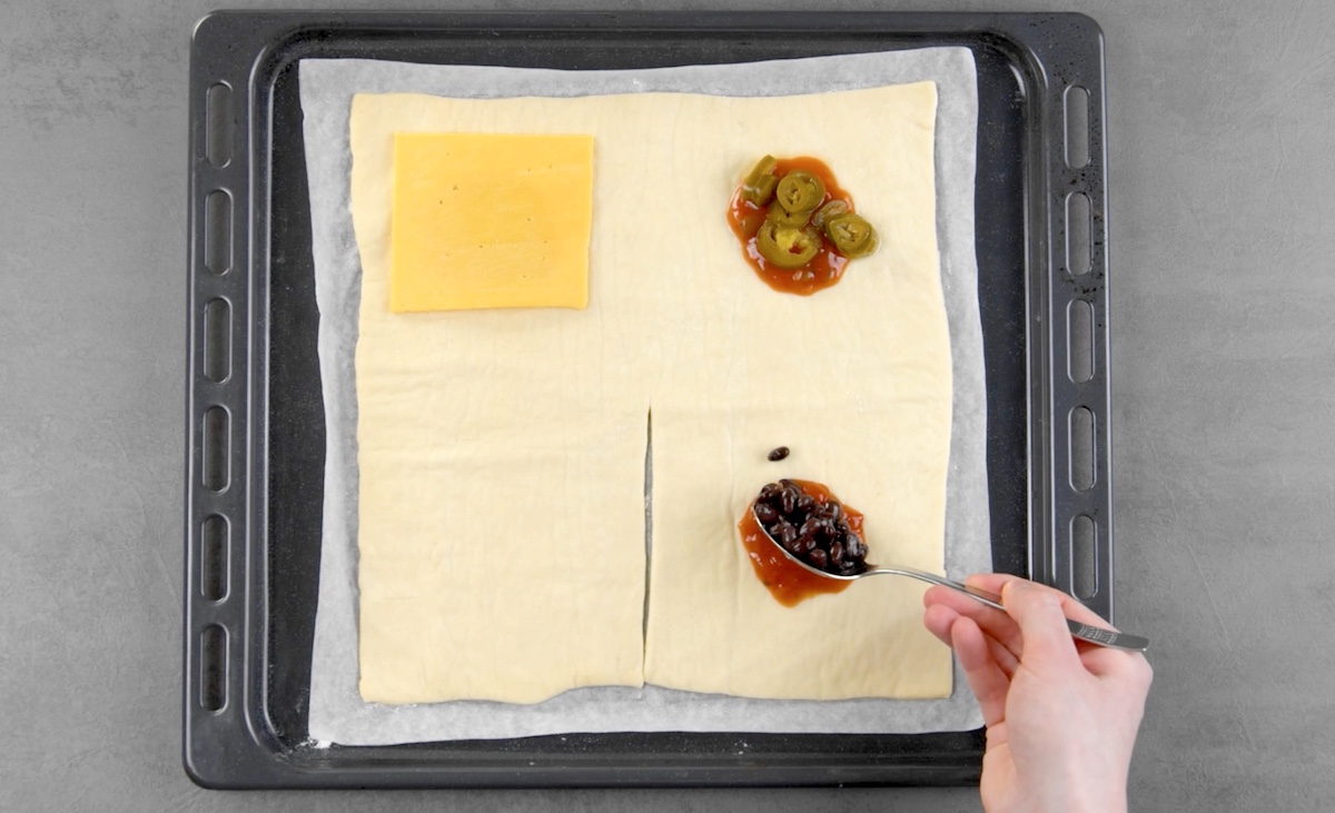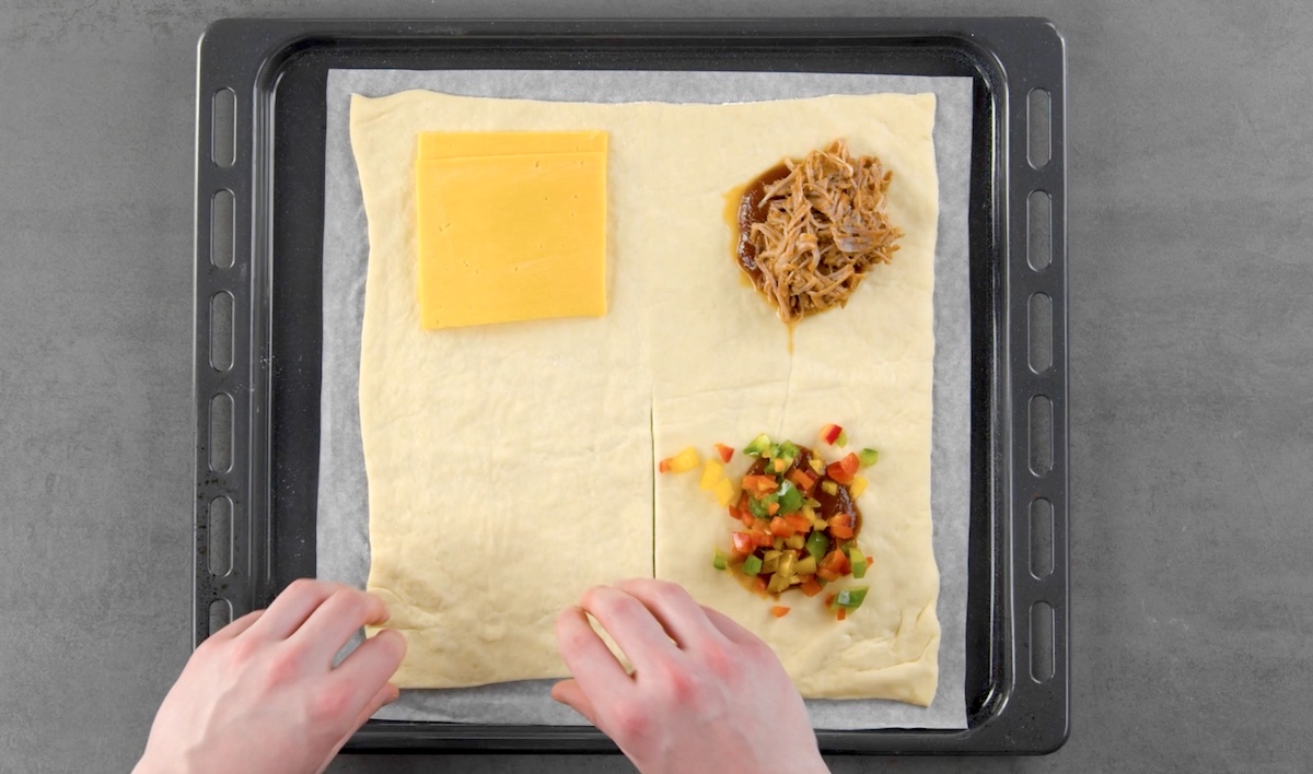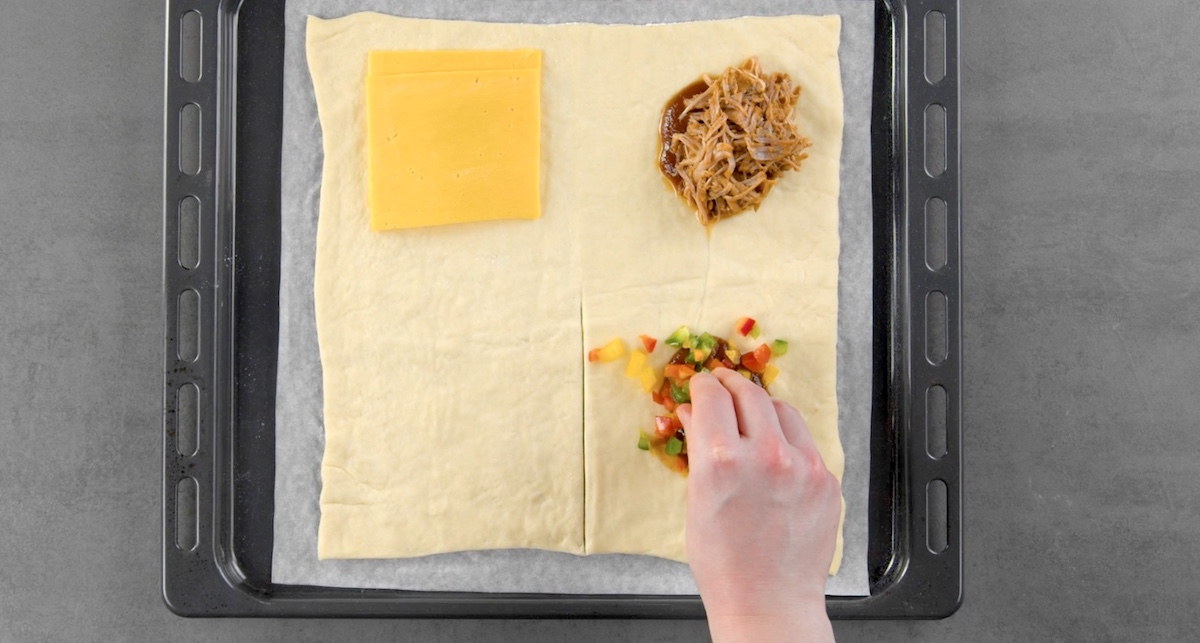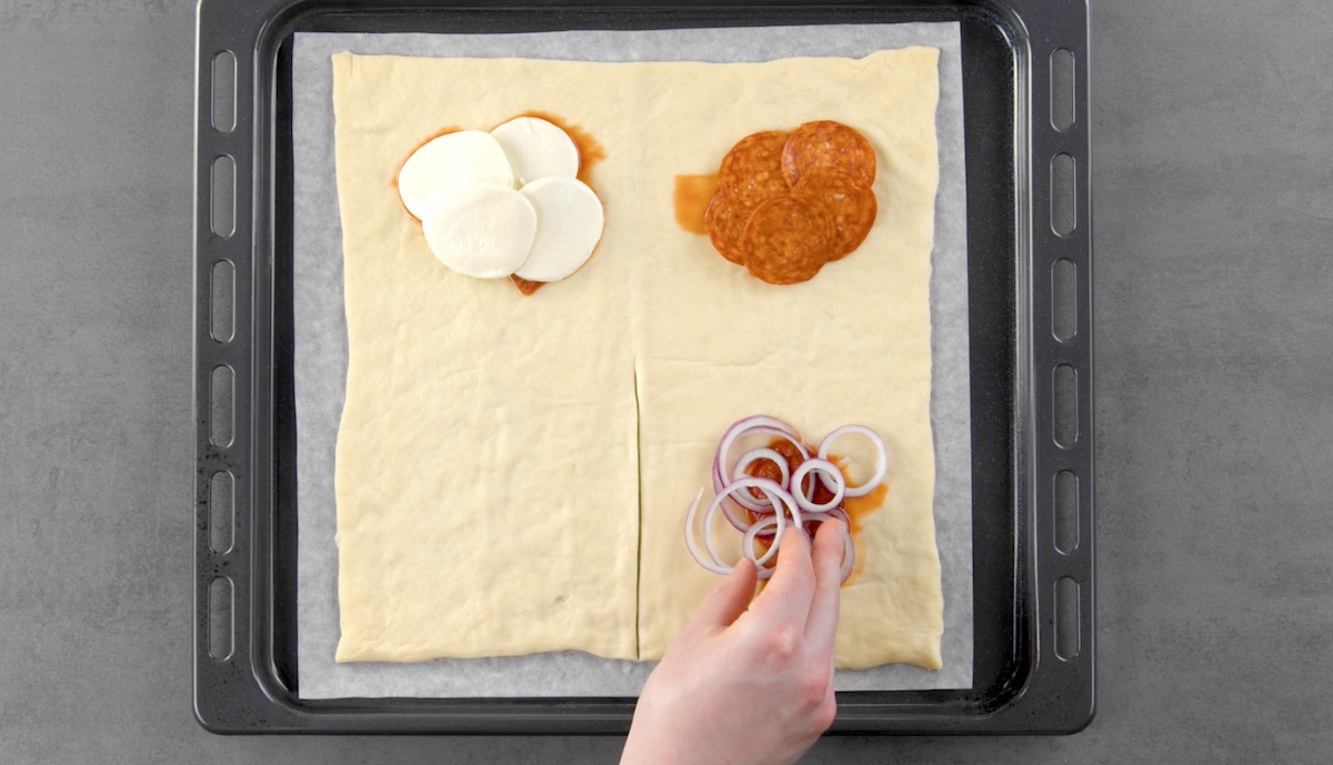 2. Belege dann drei Abschnitte auf dem Pizzateig mit beliebigen Zutaten.