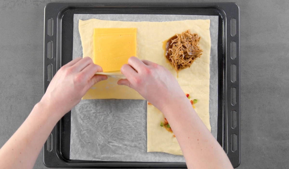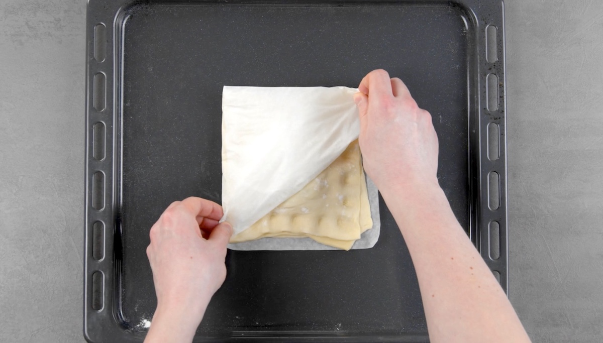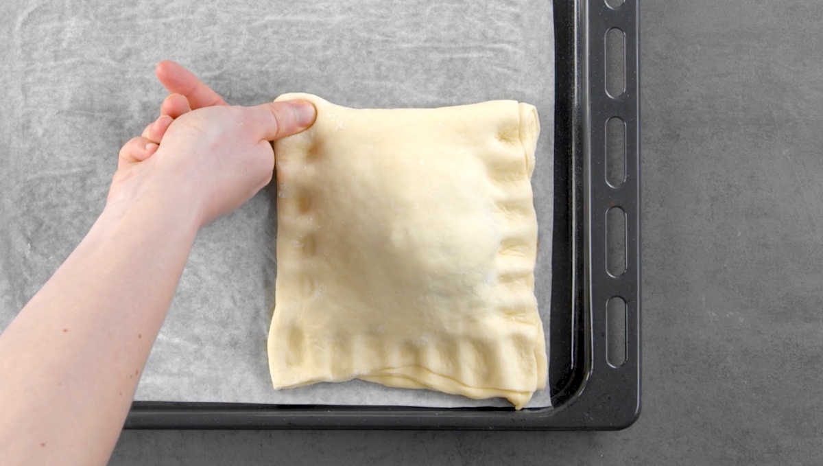 3. Lege das unbelegte Pizzateigquadrat dann über das angrenzende, belegte Stück.