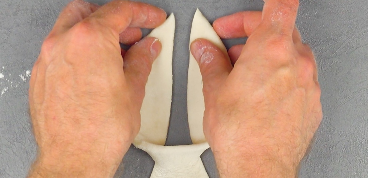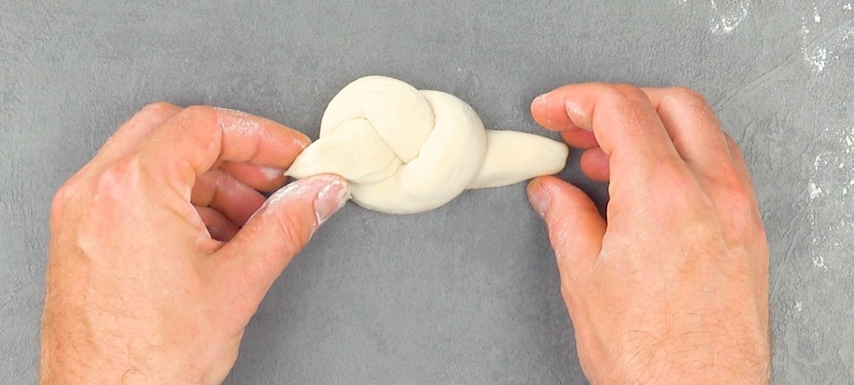 3.1 Forme den Teig zu einer länglichen Rolle. Verknote die Rolle in der Mitte und forme an einer Seite einen Schnabel.