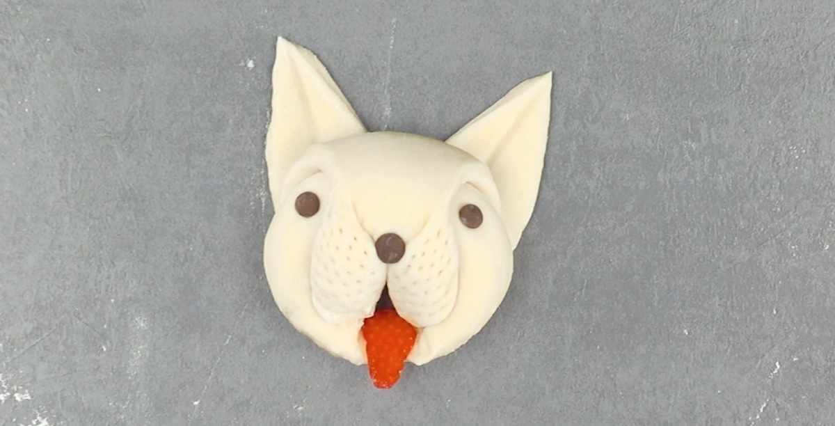 5.6 Lass das süße Hundegesicht 30 Minuten ruhen, überziehe es dann mit Eistreiche und backe es anschließend für 20 Minuten bei 180 °C Ober-/Unterhitze.
