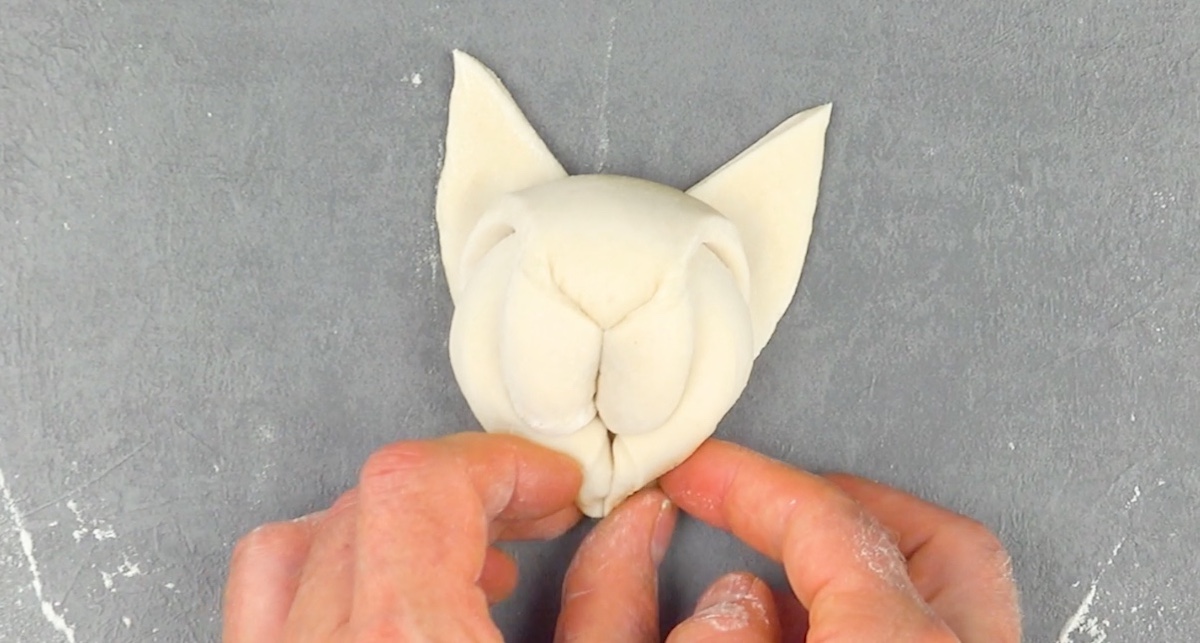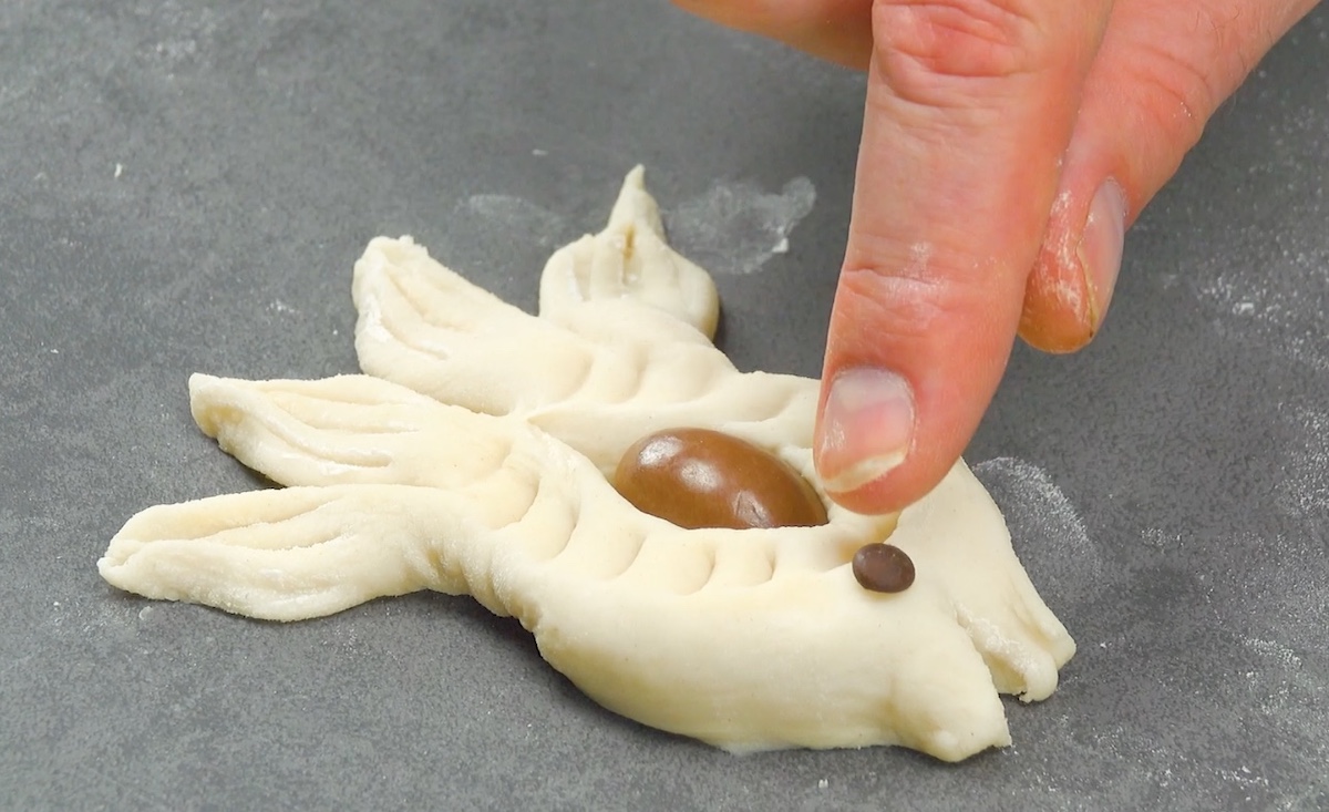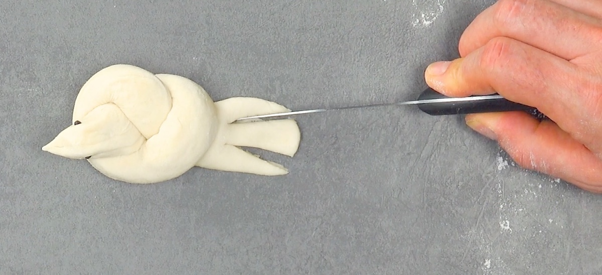 3.2 Drücke Schokoperlen als Augen in den Brioche-Teig. Plätte das Schwanzende und schneide es mit einem Messer zweimal ein