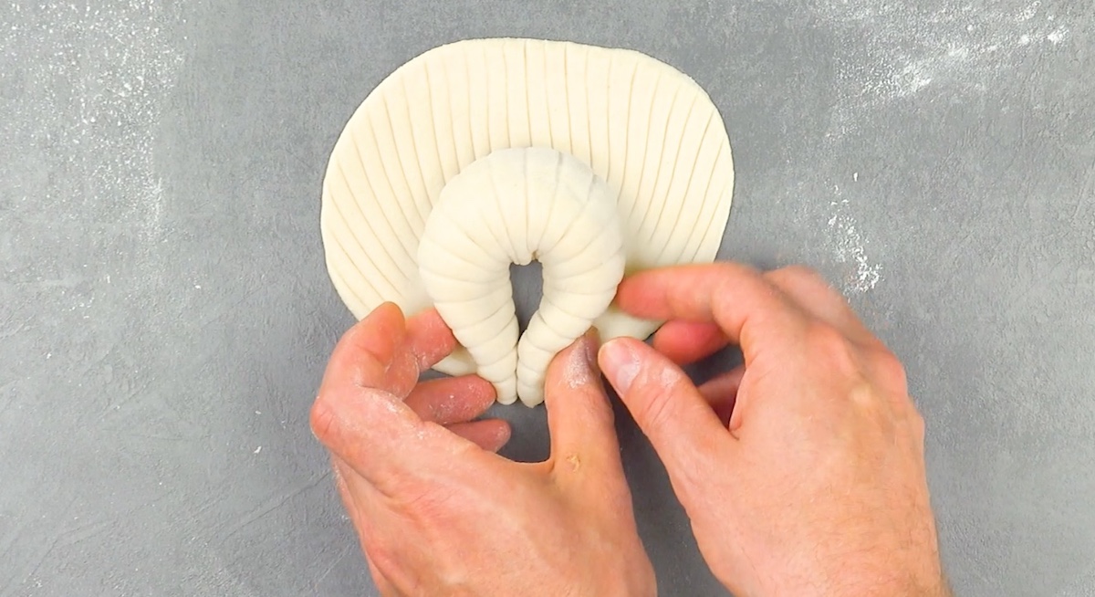 7.3 Klappe nun die entstandenen Teigschlaufen abwechselnd nach links und rechts auf.