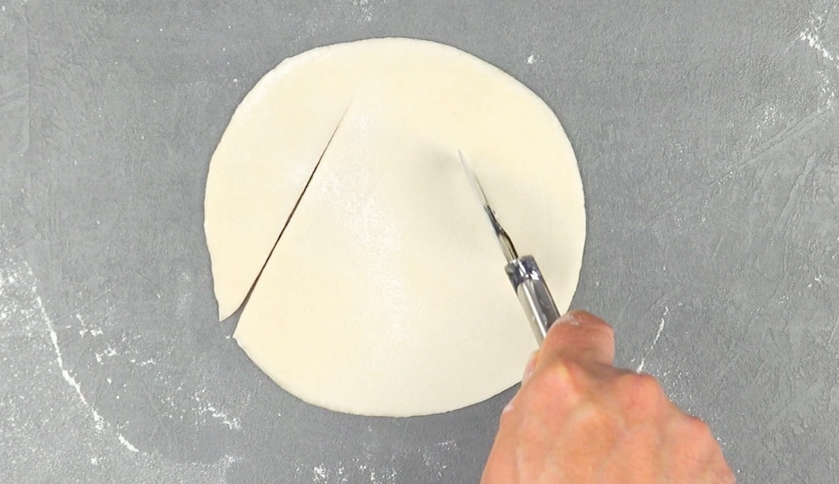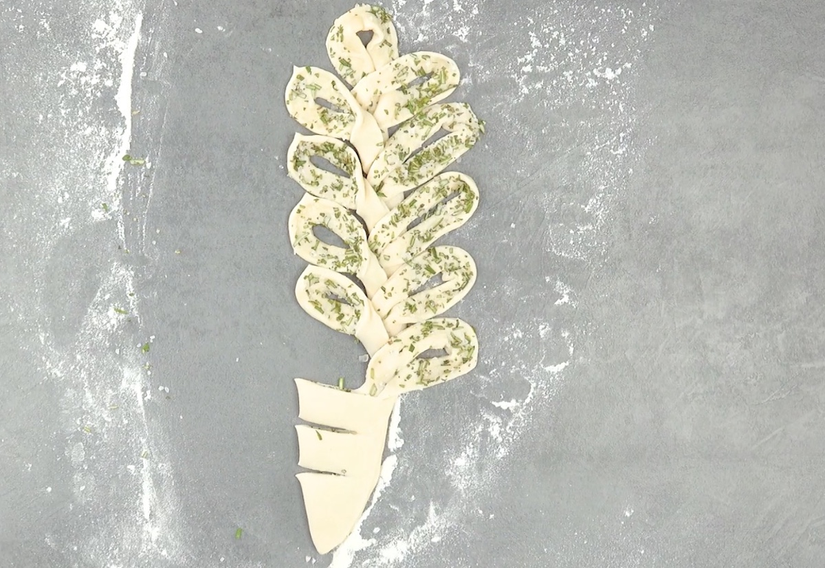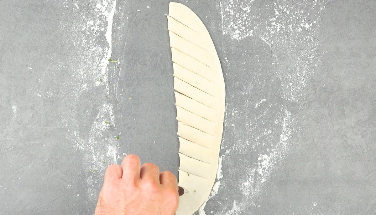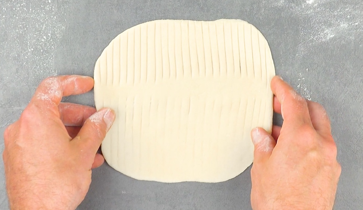 5.1 Rolle den Teig aus und schneide ihn zweimal schräg ein.