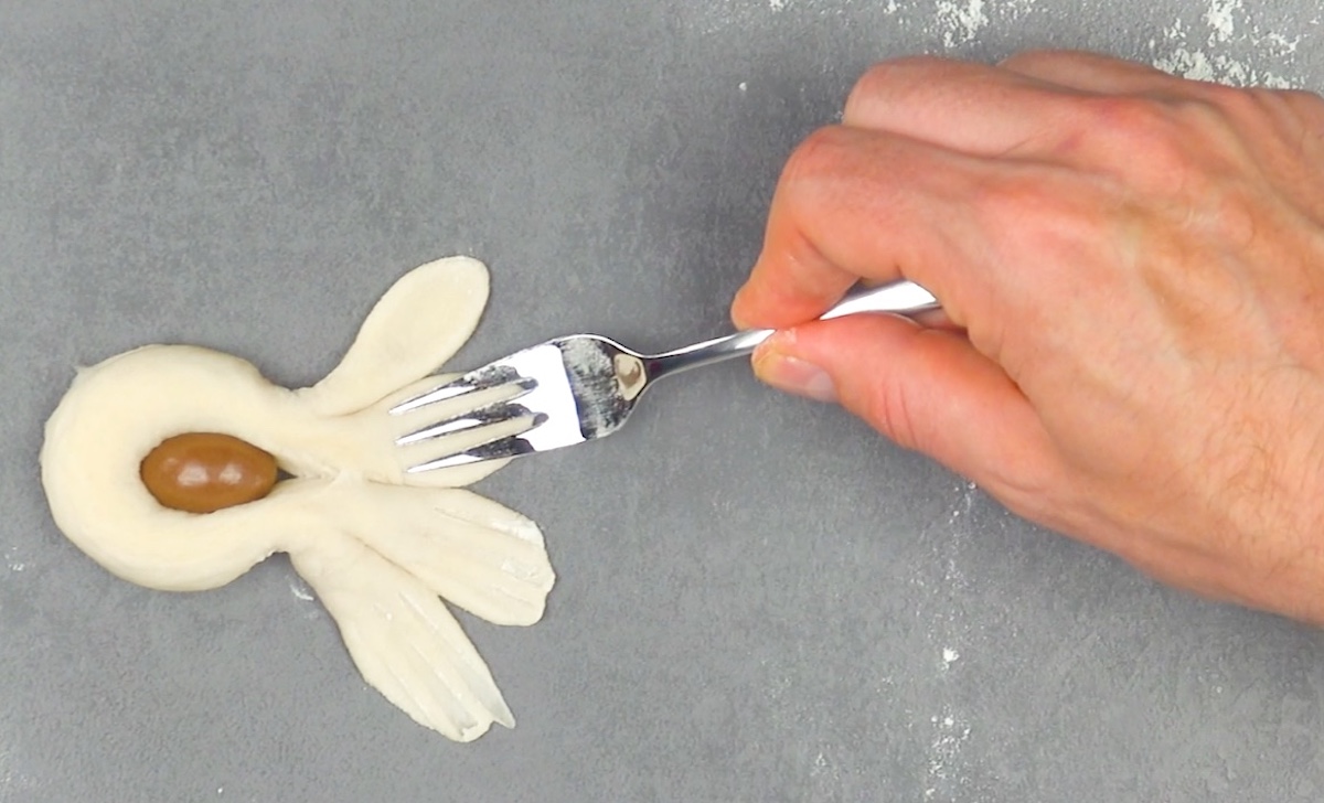 1.1 Forme den Teig zu einer länglichen Rolle. Lege diese um einen Schokobon und drücke sie dahinter zusammen. Schneide die überstehenden Enden ein, forme sie zu Flossen und drücke mit einer Gabel ein entsprechendes Muster hinein.