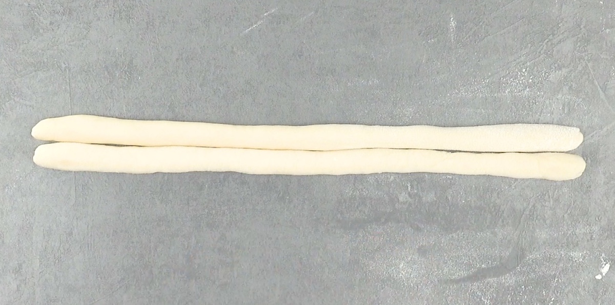 6.1 Forme aus dem Brioche-Teig zwei gleich große Rollen. Achte darauf, die Teigrollen mit ausreichend Mehl zu bestreuen, damit sie nicht zusammenkleben.