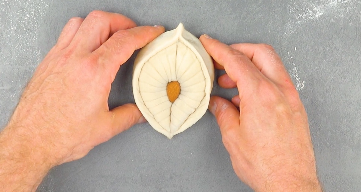 4.4 Klappe die Ränder nach oben, forme zwei Spitzen und lege eine Mandel in die Mitte.