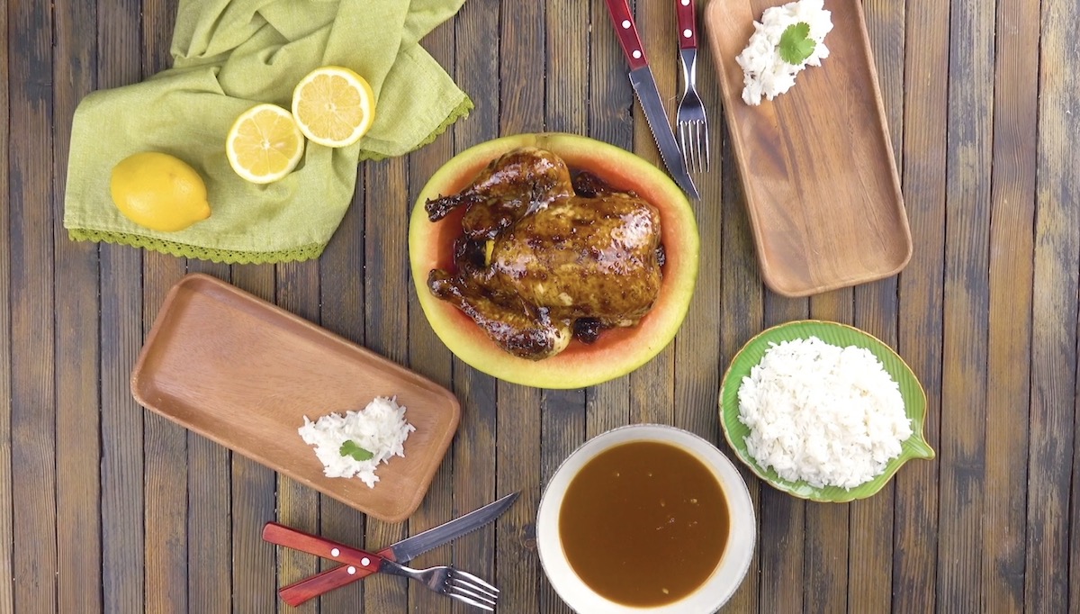 Wassermelone ist die perfekte Sommerfrucht! Nicht nur besteht das Fruchtfleisch zu rund 96 % aus Wasser, von dem man bei hohen Temperaturen unbedingt viel zu sich nehmen sollte. Das Obst enthält außerdem wertvolles Vitamin A und C, Protein sowie Antioxidantien. Dieses Rezept beweist, dass die grüne Kugel auch richtig flexibel ist: Du kannst nämlich mindestens ein sehr leckeres Hauptgericht mit ihr zaubern. Die Melone dient dabei als Form und bietet zugleich einen Zusatz zur Soße!