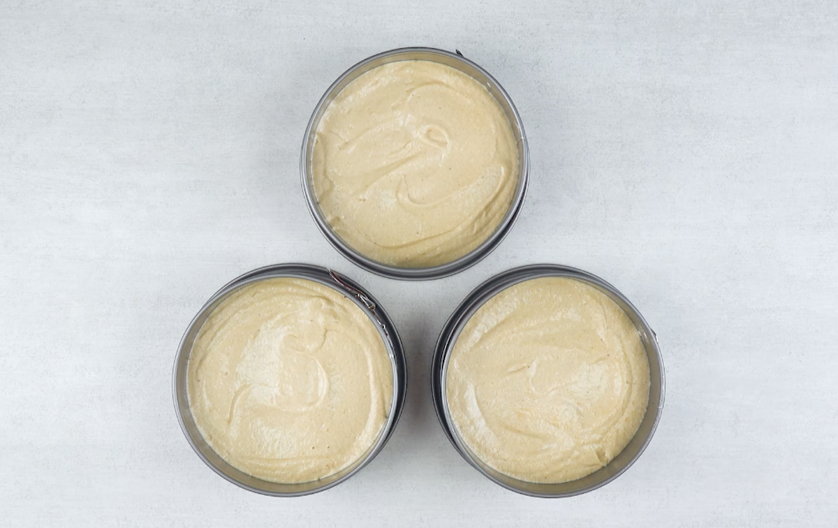 1. Schlage Butter mit braunem und weißem Zucker sowie Öl schaumig auf. Gib nach und nach Eier hinzu und schlage alles weiterhin, bis es sich gut miteinander verbunden hat. Dann kommen Mehl, Cidre, Backpulver, Milch, Vanillearoma, Salz und Zimt dazu. Verrühre nochmals alles mit einem Handmixer. Teile den Teig auf die 3 Springformen auf (ca. 430 g pro Form) und backe alle drei Formen bei 175 °C Umluft für ca. 25 Minuten. Nach dem Backen lässt du alle drei gebackenen Teige komplett auskühlen.