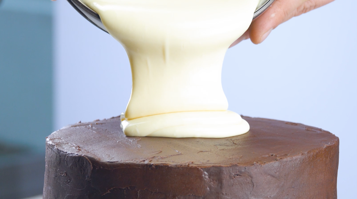 8. Erhitze Sahne – Achtung: nicht kochen lassen – und gieße sie über die kleingehackte, weiße Kuvertüre. Verrühre alles so lange mit einem Gummispachtel, bis sich alles gut verbunden hat. Lasse alles etwas abkühlen und dann die weiße Ganache über den Kuchen laufen, sodass ringsherum Tropfen herunterrinnen.