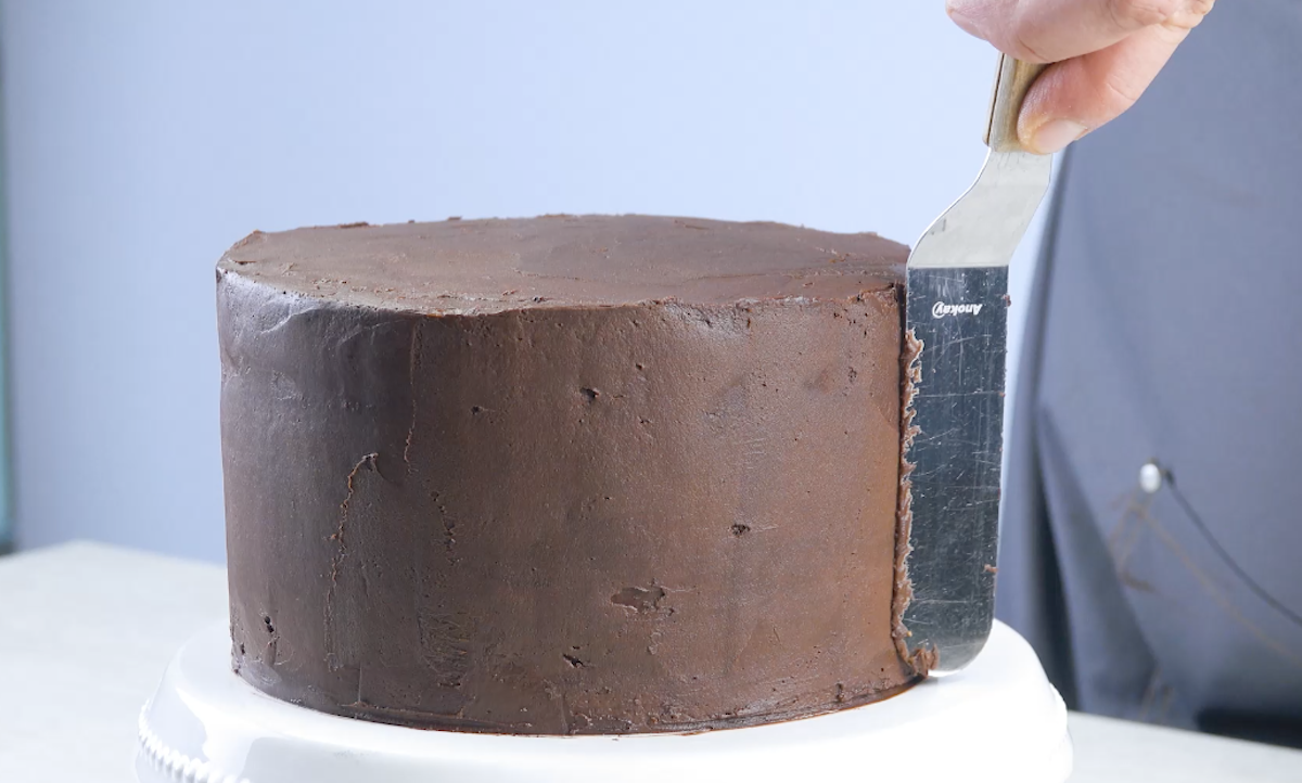 6. Setze den dritten und letzten Kuchenboden obendrauf und verkleide den Kuchen komplett mit dem restlichen Schokofrosting.