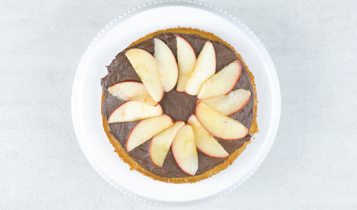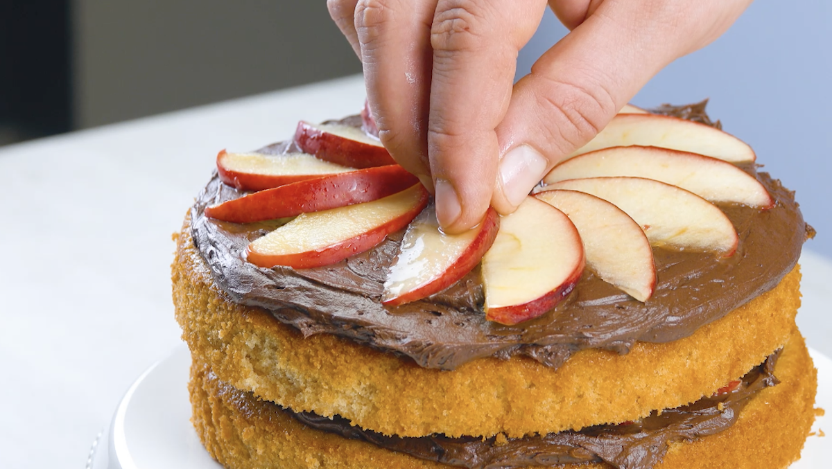 5. Setze einen weiteren Kuchenboden obendrauf und belege diesen ebenfalls mit Schokofrosting und Äpfeln.