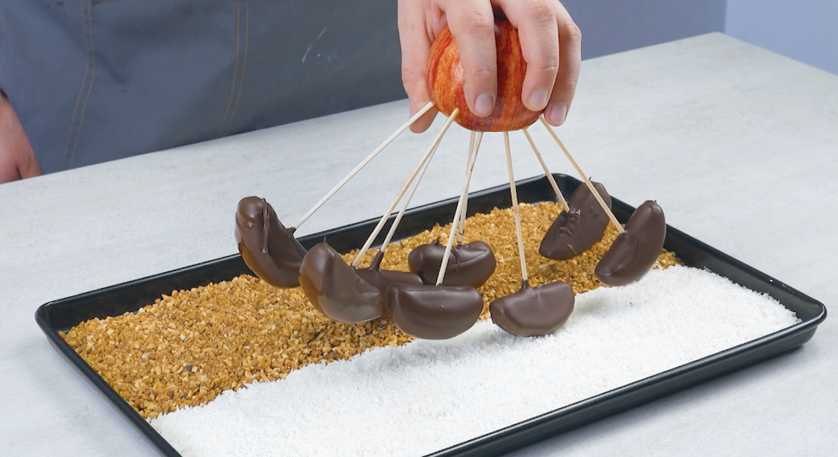 7. Für die Apfel-Deko schälst und achtelst du einen Apfel. Bringe die Kuvertüre zum Schmelzen. Baue dir nun eine Art Panierstraße auf (geschmolzene Kuvertüre, Kokosflocken und Krokant). Spieße die Apfelstücke auf Holzspieße und ziehe sie durch die geschmolzene Kuvertüre. Lasse sie dann gut abtropfen und tauche sie halbseitig entweder in Krokant oder in Kokosflocken (du kannst sie alle einzeln „panieren“ oder eben alle gleichzeitig mit dem Trick, der im Video gezeigt wird).
