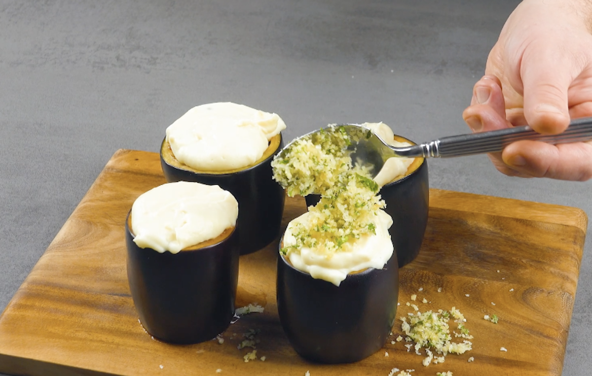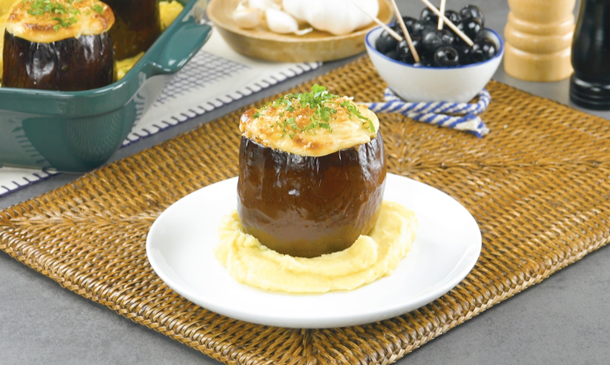 Ob vegan, vegetarisch oder mit herzhafter Fleischfüllung – die Aubergine ist einfach ein richtiger Allrounder. Mit Hackfleisch gefüllte Auberginen sind ein Klassiker, der nicht nur in der orientalischen Küche gerne zubereitet wird. Wir füllen die Aubergine heute mit Lammhack und Käsesoße, verfeinern diese mit einem knusprig gebackenen Topping aus geriebenem Pecorino und betten das gefüllte Gemüse auf einer Schicht aus samtigen Kartoffelpüree.