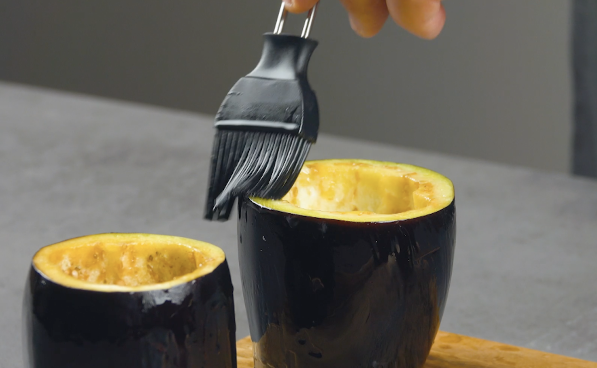 2. Schneide beide Enden der Auberginen ab. Stelle die Fruchtkörper aufrecht auf ein Brettchen und höhle sie mit einem Kugelausstecher aus. Pinsle die Auberginen sowohl innen als außen mit Olivenöl ein. Stelle sie dann erst einmal beiseite.