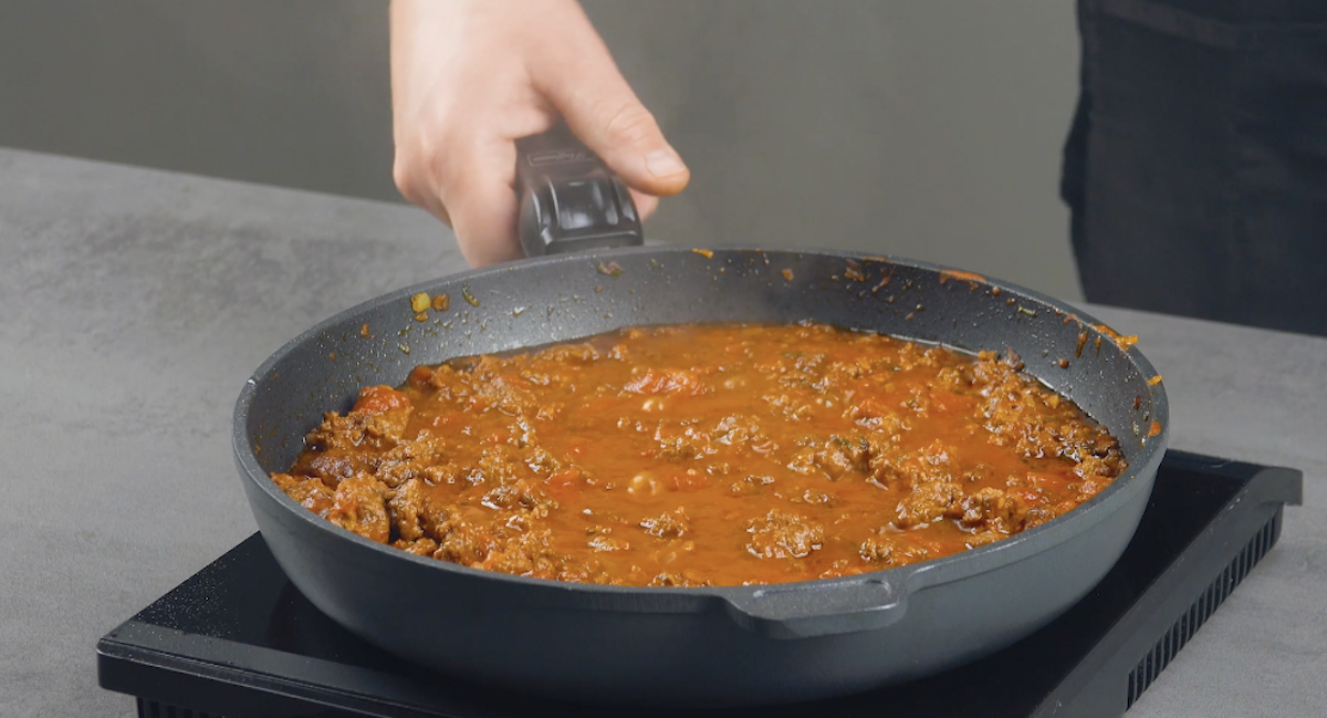3. Brate das Lammhack mit Olivenöl in einer Pfanne an. Gib kleingehackte Zwiebeln und Knoblauch hinzu und brate beides kurz mit an. Füge dann Paprikapulver, Zimt, Minze, Salz, Pfeffer und Tomatenmark hinzu. Lösche alles mit Rotwein ab und lasse den Wein kurz einreduzieren. Zum Schluss kommen noch die gehackten Tomaten mit in die Pfanne. Lasse alles ca. 15 Minuten köcheln.