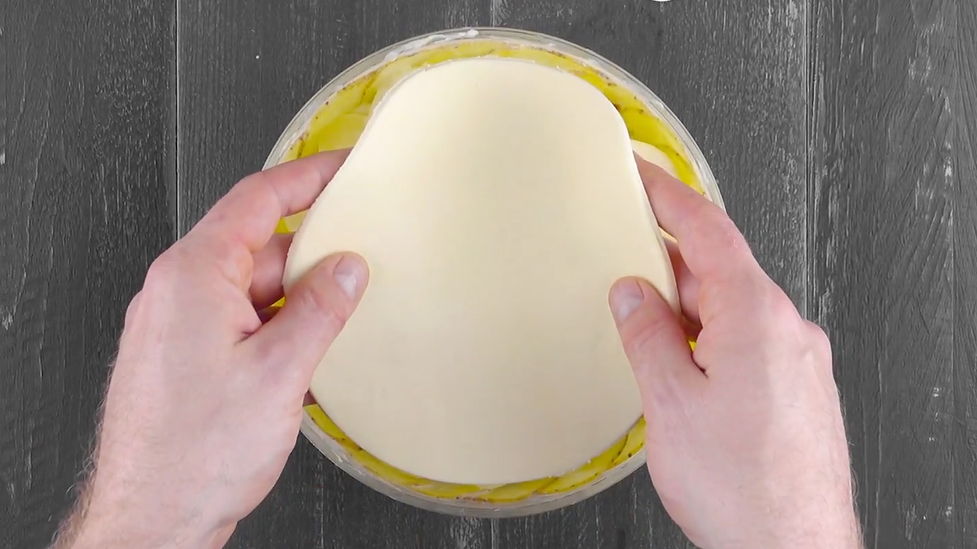 - Lege die gefettete Schüssel mit den Kartoffelscheiben aus. Zuerst den Boden mit einer einzelnen Scheibe, dann Reihe um Reihe bis zum Rand. Zusätzlich lege eine weitere Schicht Kartoffelscheiben auf den Boden der Schüssel.