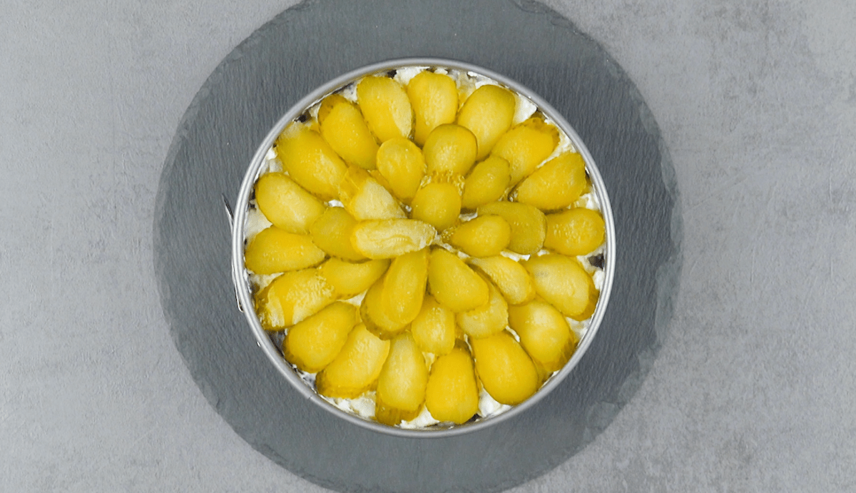 - Gib den Kartoffelsalat in die Springform und streiche ihn mit einem Löffel glatt. Schneide die noch verbliebenen Gurken in dünne Scheiben und verteile sie gefächert und kreisförmig auf dem Kartoffelsalat. Stelle den Kartoffelsalat-Kuchen erst einmal kalt.