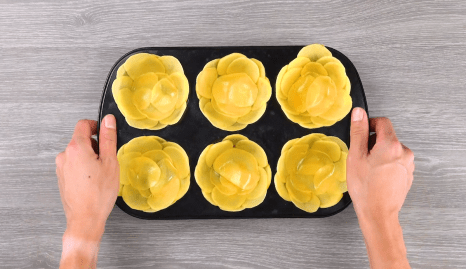 - Schichte die dünnen Kartoffelscheiben in die einzelnen Mulden der Muffinform, stelle diese anschließend in den vorgeheizten Backofen und backe sie etwa 15 Minuten bei 180 °C Umluft.Tipp: Wenn du die Kartoffelscheiben wässerst oder vorgarst, erzielst du ein noch besseres Ergebnis!