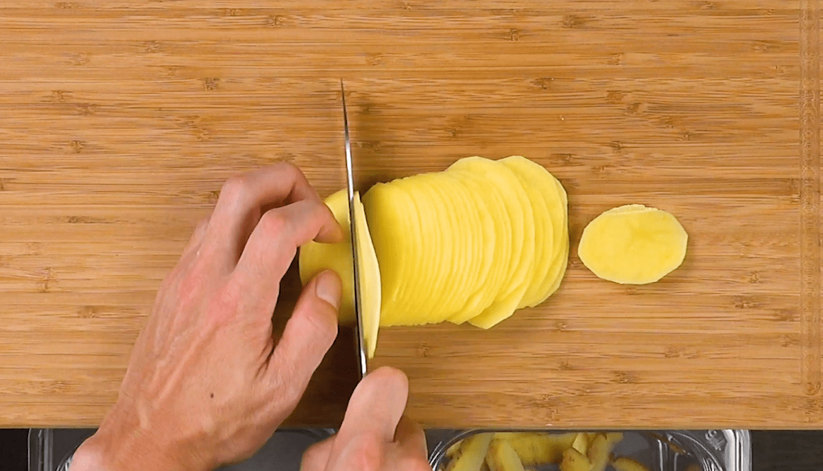 - Schäle die Kartoffeln und schneide sie in feine Scheiben. Mariniere sie in Salz, Paprikapulver und Öl.