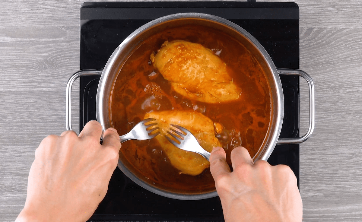 - Brate für die „Pulled Chicken“-Variante die Hähnchenbrust in einem Topf in etwas Öl an. Vermische die BBQ-Soße mit Orangensaft, Paprikapulver und Cayennepfeffer und gib das Gemisch über die Hähnchenbrust in den Topf. Lasse das Hähnchenfleisch bei geringer Hitze in der Soße garen. Zerrupfe danach das Hähnchenfleisch mit Hilfe von 2 Gabeln in kleine „Fetzen“.