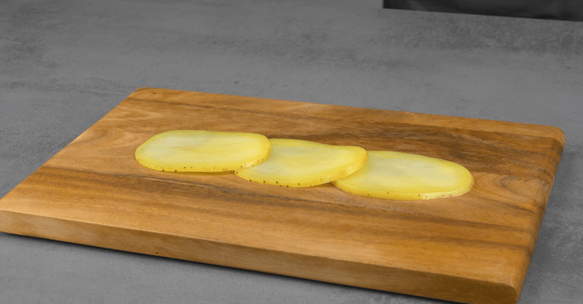 - Schneide die Kartoffeln längs in schmale, ca. 2-3 mm dünne Scheiben. Lege diese Scheiben in Salzwasser und lasse sie nur kurz aufkochen, damit sie flexibel sind.