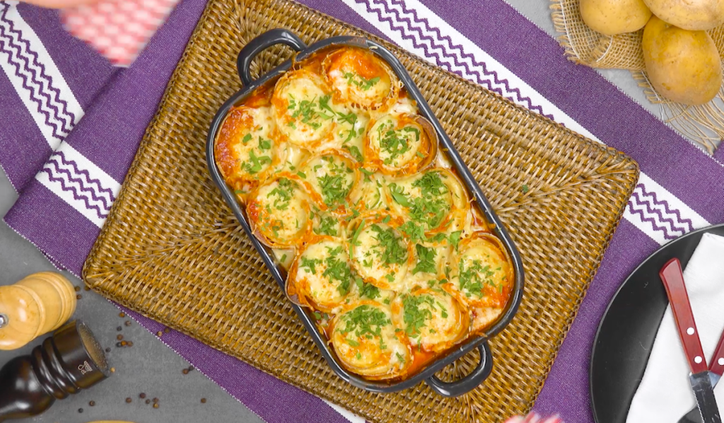 Dieser Kartoffelauflauf sieht durch die hochkant aufgestellten Röllchen aus Kartoffeln richtig hübsch aus. Serviere 1 bis 2 Röllchen pro Teller und gib einen Löffel Tomatensoße hinzu. Eine wirklich kreative Art, Kartoffeln im Auflauf zuzubereiten.