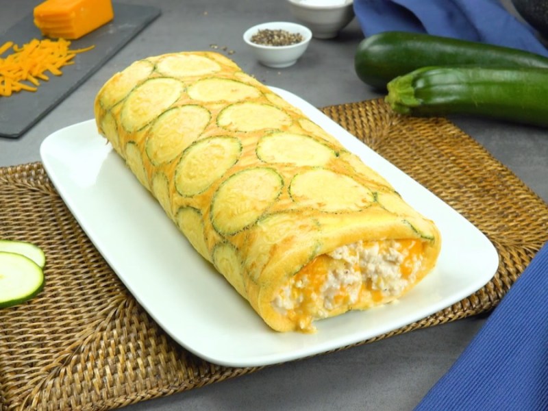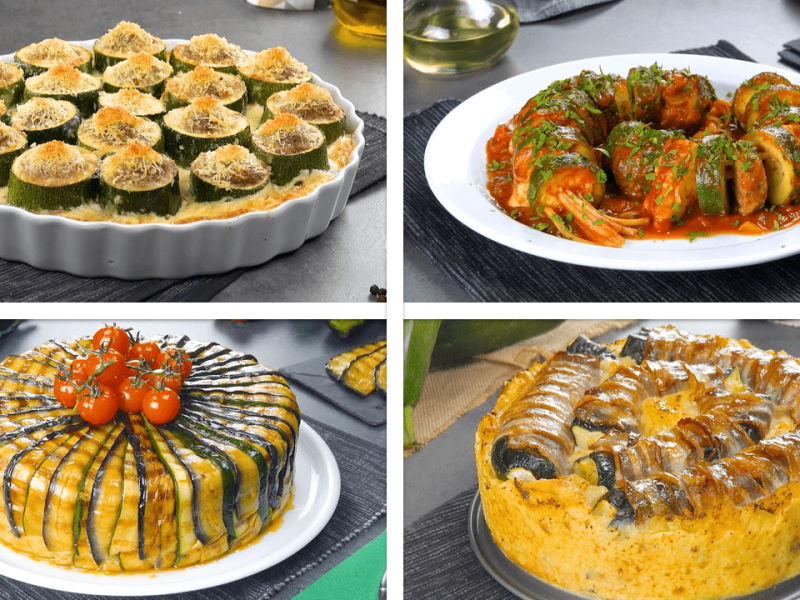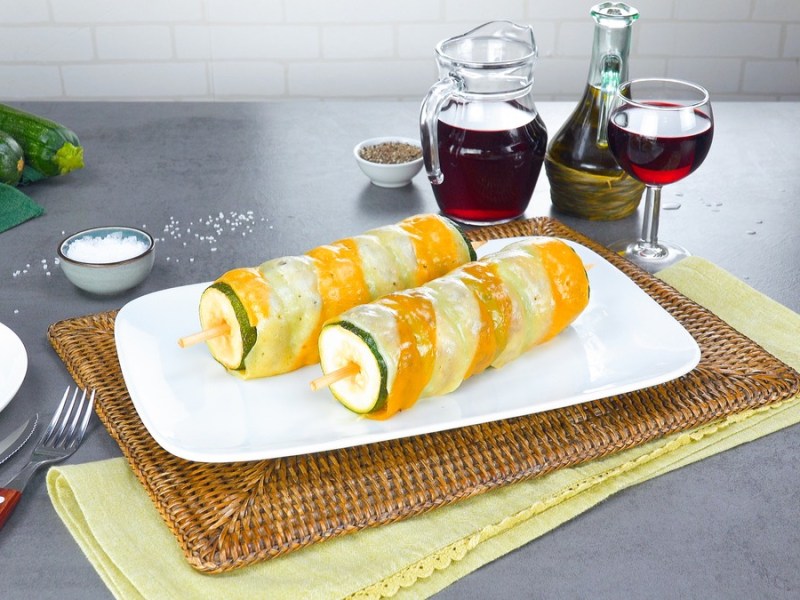 Zucchini-Kuchen mit Risotto und Schinkenröllchen