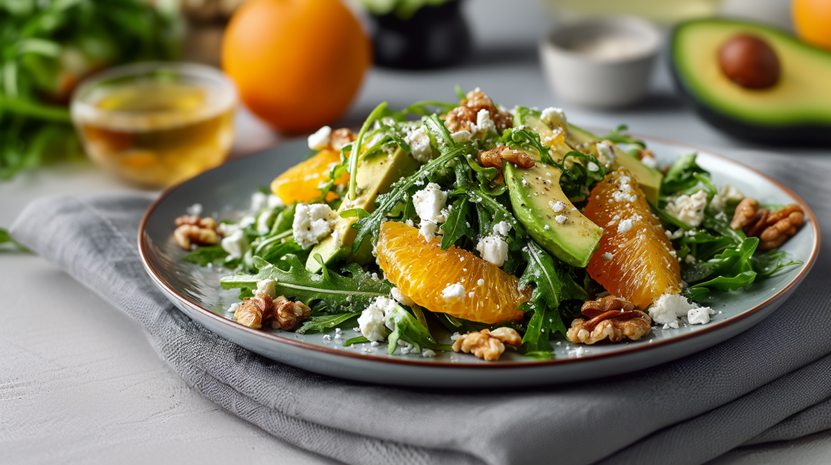 Manchmal braucht es wirklich nur ein paar ausgewählte Zutaten, um etwas Leckeres zu zaubern. Unser Avocado-Orangen-Salat fällt genau in diese Kategorie. Er funktioniert wunderbar als Begleiter für ein Abendessen oder als leichtes Lunch. Die zarte Avocado harmoniert grandios mit der Süße der Orangen und dem knackigen Biss des Rucolas. Dazu noch ein wenig Feta und geröstete Walnüsse – fertig ist der gesunde Genuss!