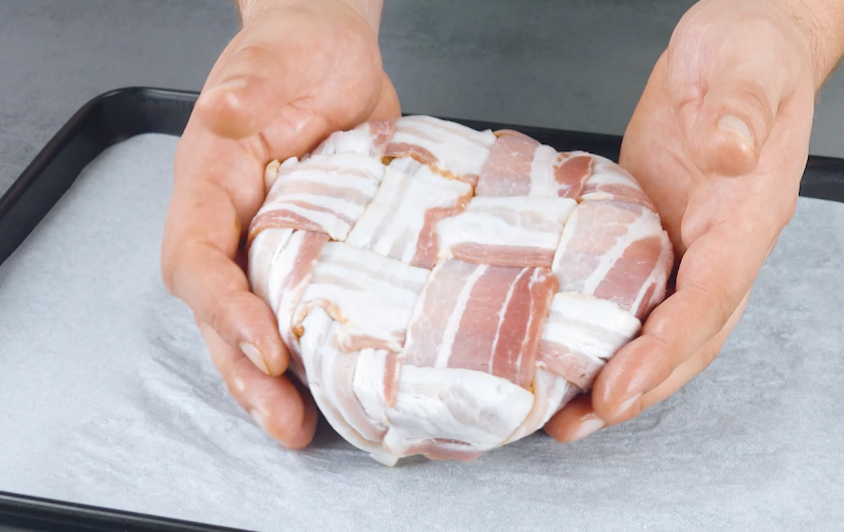 2. Flicht 5 x 4 Scheiben Bacon zu einem Gitter, lege dieses auf ein mit Backpapier ausgelegtes Backblech und stelle es für 30 Minuten in den Kühlschrank.