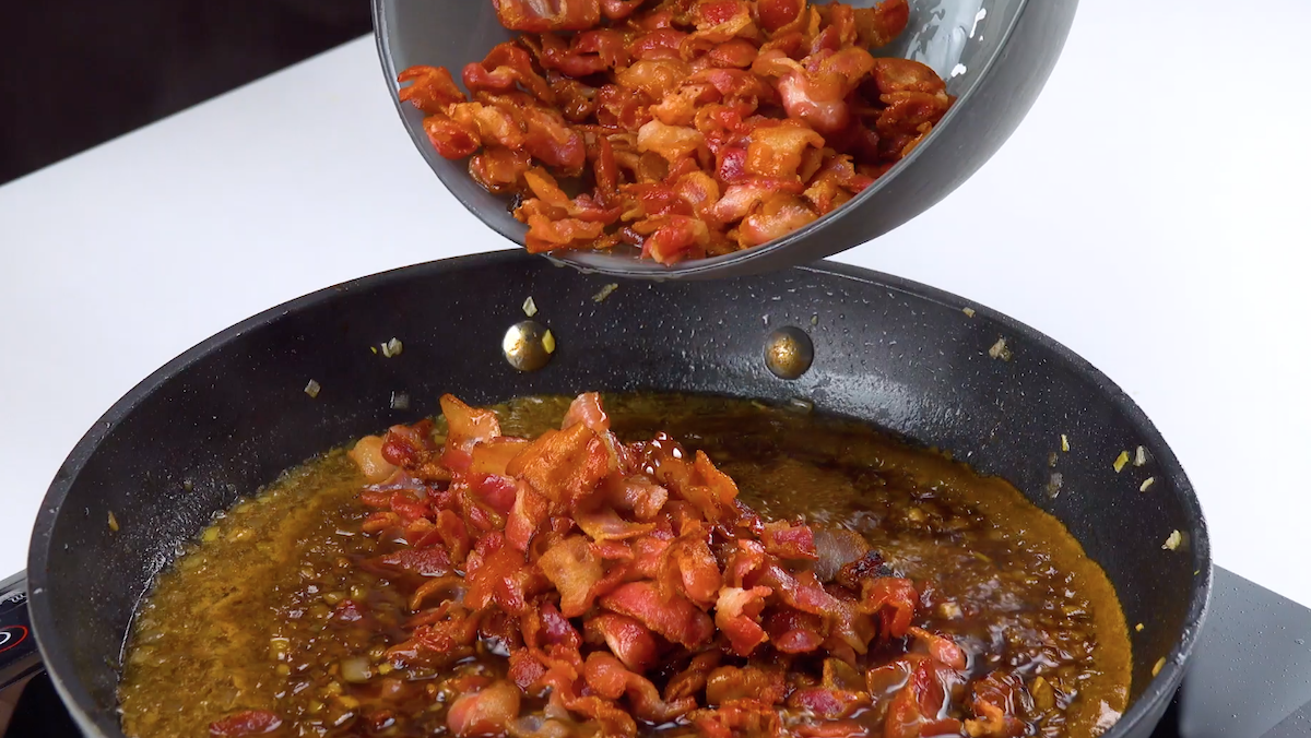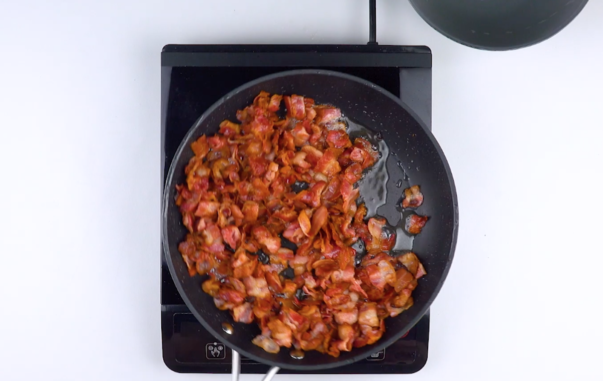 1.) Schneide den Bacon klein und brate ihn in einer Pfanne knusprig an. Nimm ihn dann heraus und stelle ihn kurz beiseite.