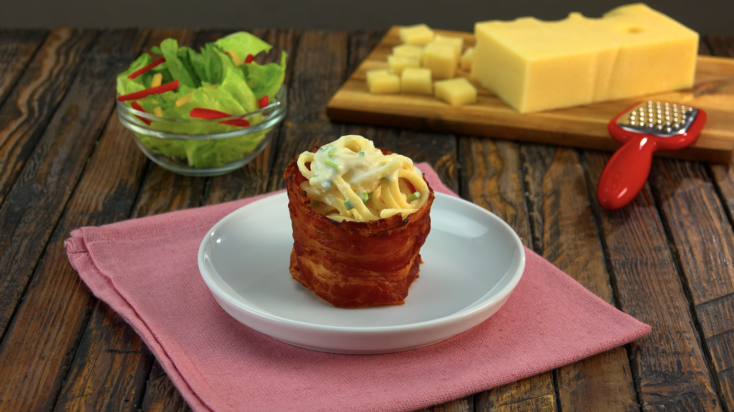 5.) Käsenudeln im Bacon-Körbchen Dafür brauchst du (für 2 Portionen):