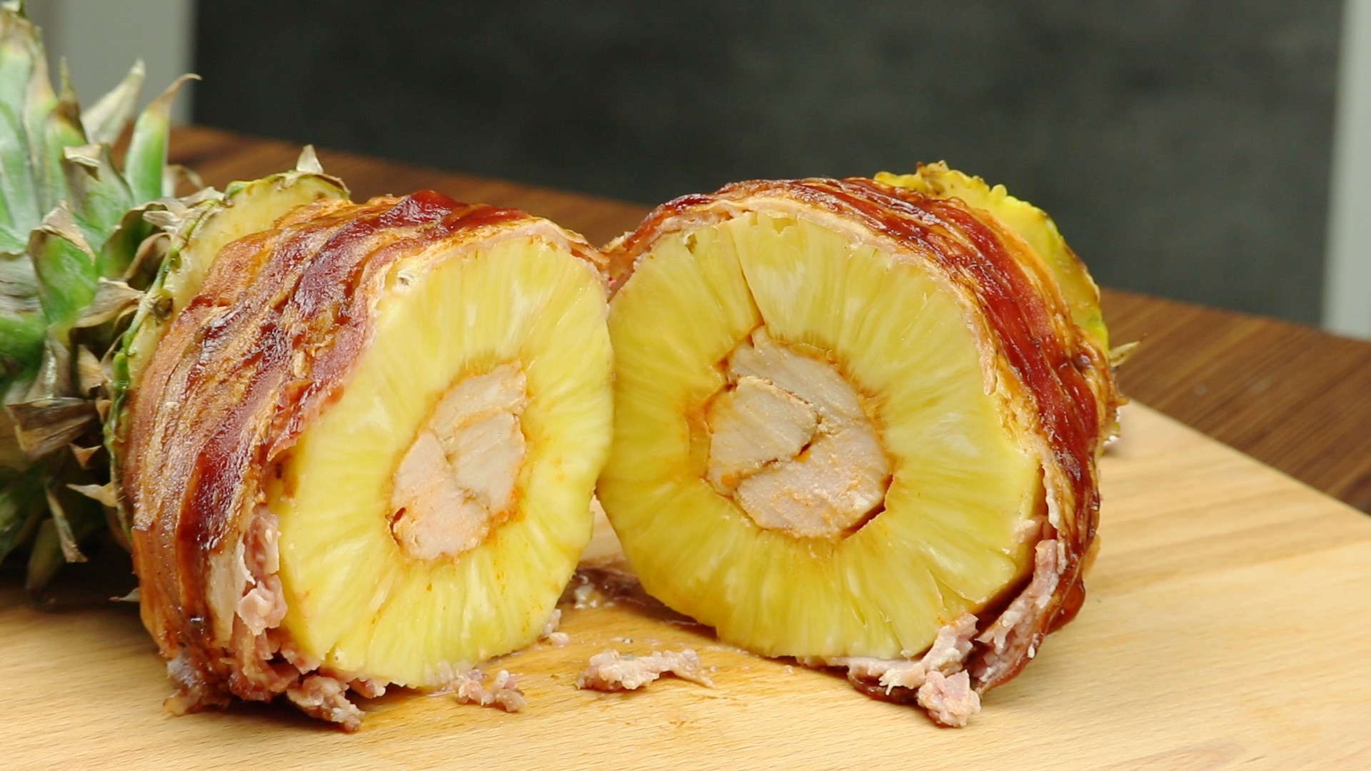 - Nun wird die gewürzte Ananas mit den Baconstreifen umwickelt. Mithilfe von Zahnstochern kannst du diese befestigen. Hast du das erledigt, bestreichst du die Streifen noch mit Barbecuesoße.
