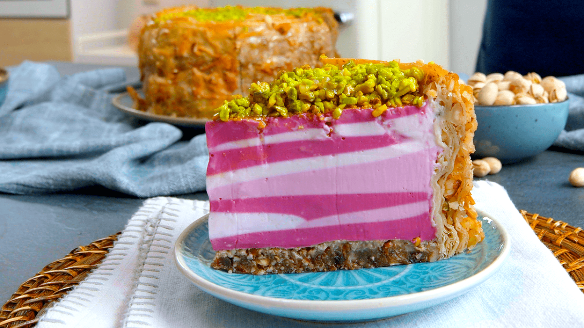 Diese Baklava-Torte mit erfrischender Himbeercreme und süßem Nussboden ist nicht nur eine tolle Abwechslung auf jeder Kaffeetafel, sondern auch das perfekte Dessert für ein ganz besonderes Menü.