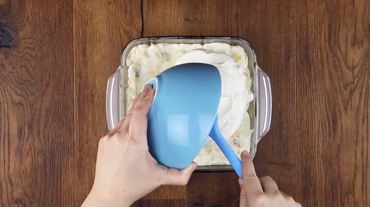 4.) Verstreiche die Creme mit den Bananenstücken auf dem Keksboden. Die nächste Schicht bildet die Schlagsahne.