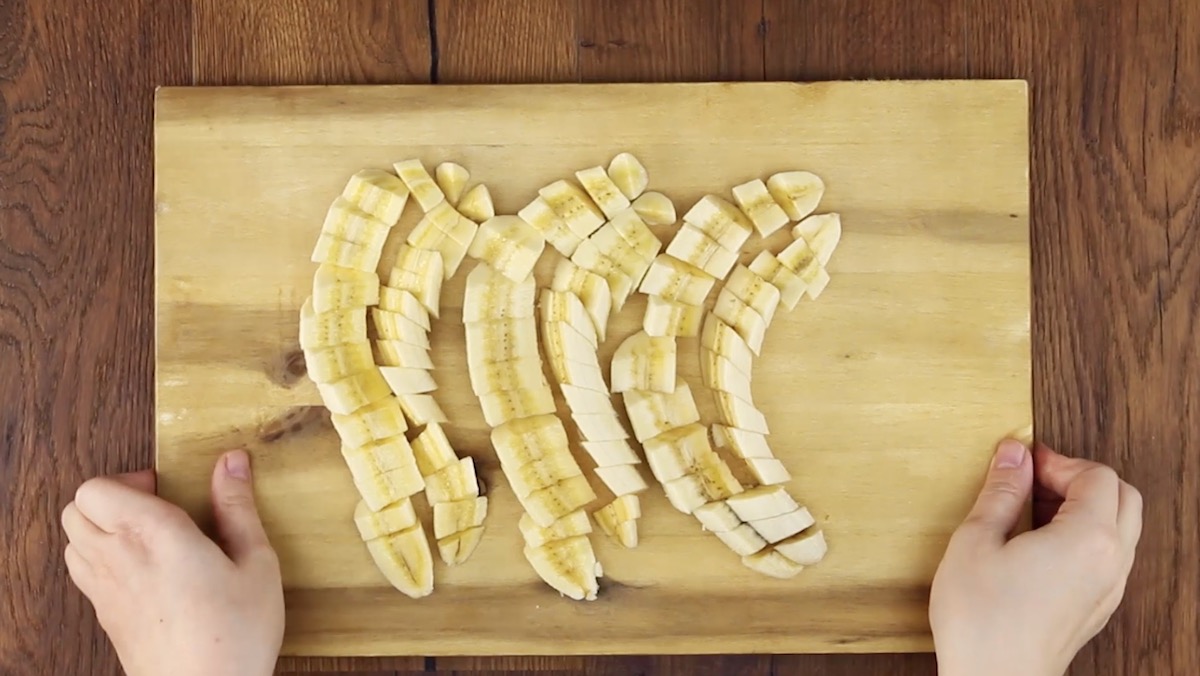 2.) Schäle die Bananen und halbiere sie der Länge nach. Die Hälften schneidest du in kleine Stücke.