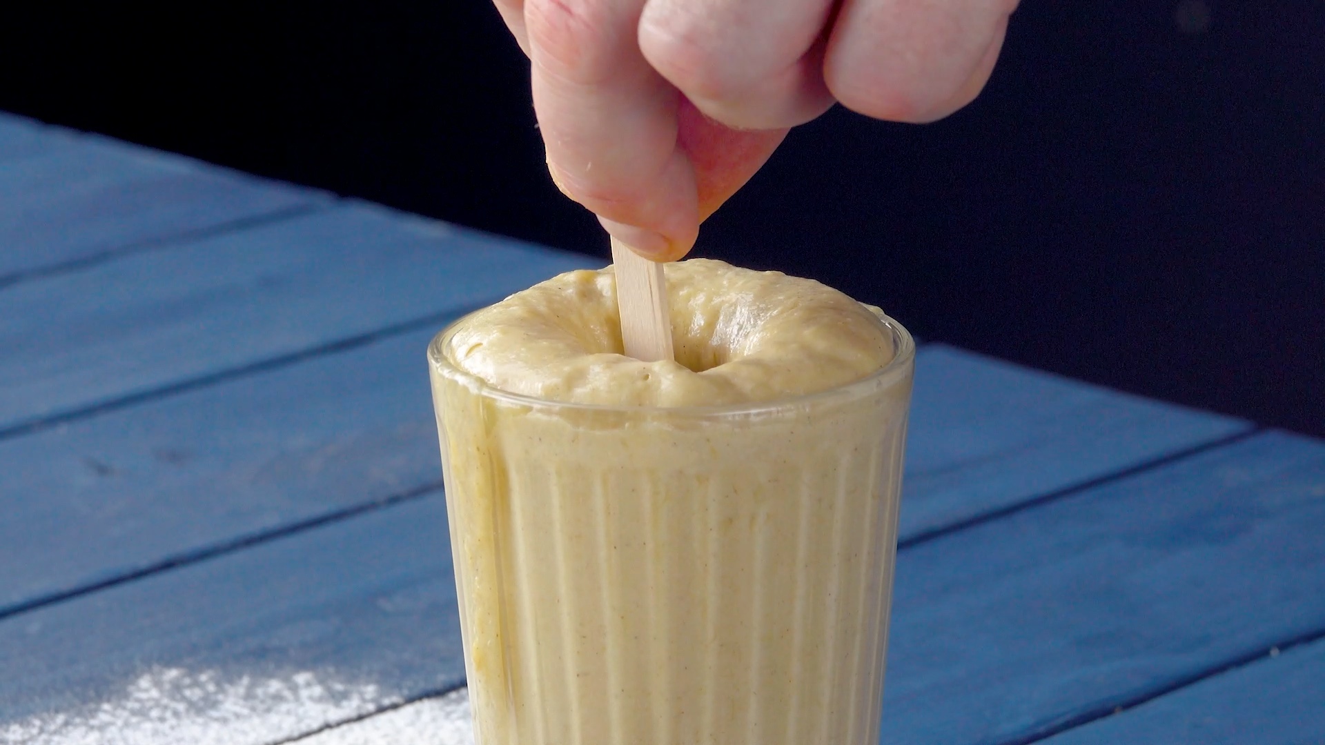 4.) Fülle den Teig in ein hohes Glas um und tauche die gefrorenen Bananen am Stiel vollständig ein.