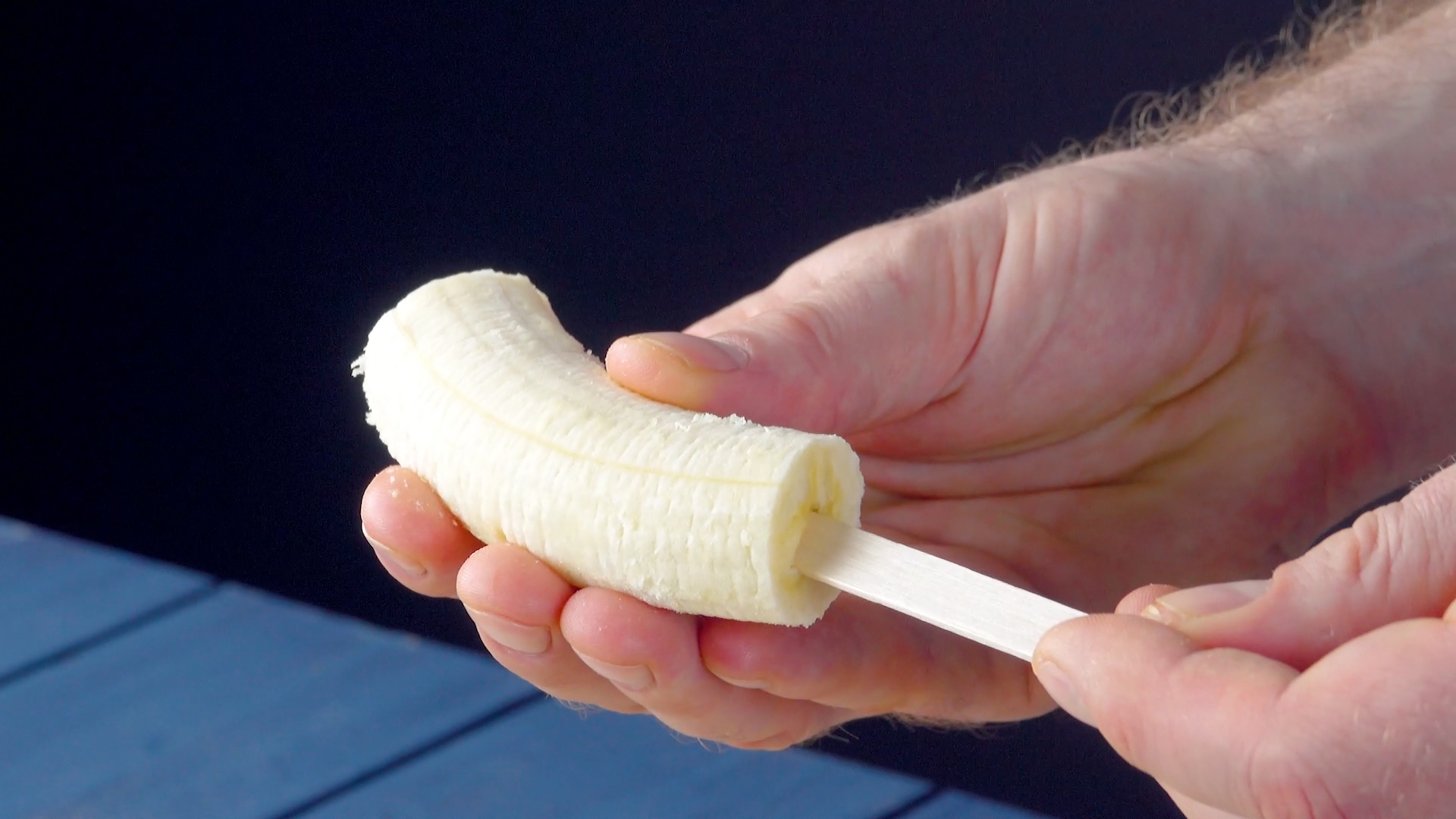 1.) Schäle die Bananen und schneide je ein mehrere Zentimeter langes Stück von Anfang und Ende ab. Lege den Verschnitt beiseite – du wirst ihn noch brauchen – und bohre in jedes große Bananenstück einen Holzstiel. Nun friere die Bananen mitsamt Stiel ein.