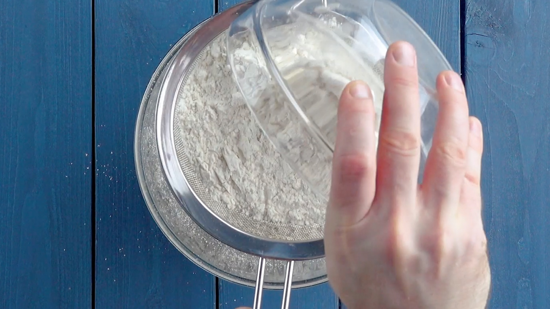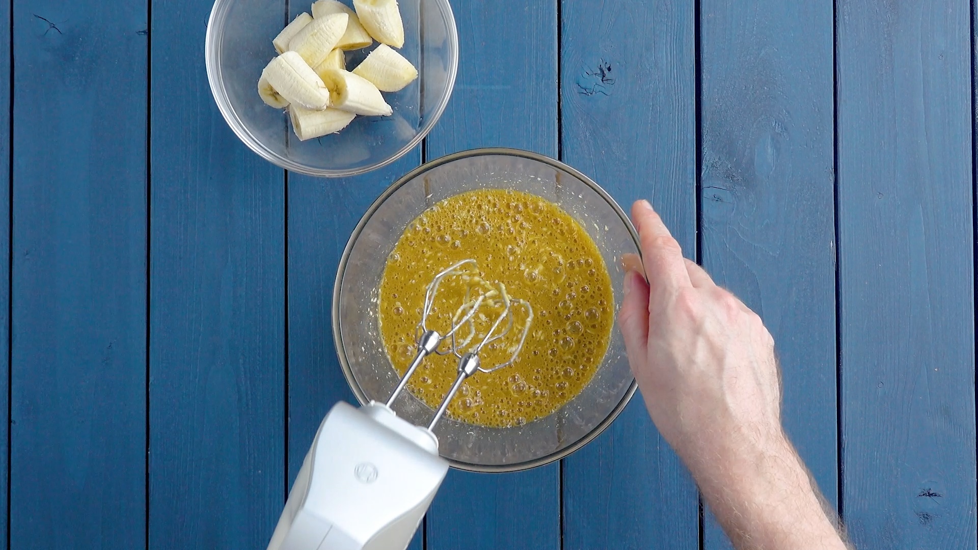 3.) Zerdrücke die noch verbliebenen Bananenanfangs- und -endstücke mit einer Gabel oder püriere sie und gib sie zum Teig. Jetzt siebst du Mehl, Zimt und Backpulver in den Teig.