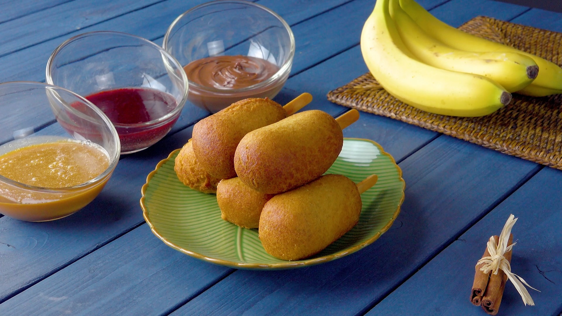 5.) Schließlich frittierst du die Portionen. Dafür kannst du sie inklusive Stiel vollständig ins Fett legen.