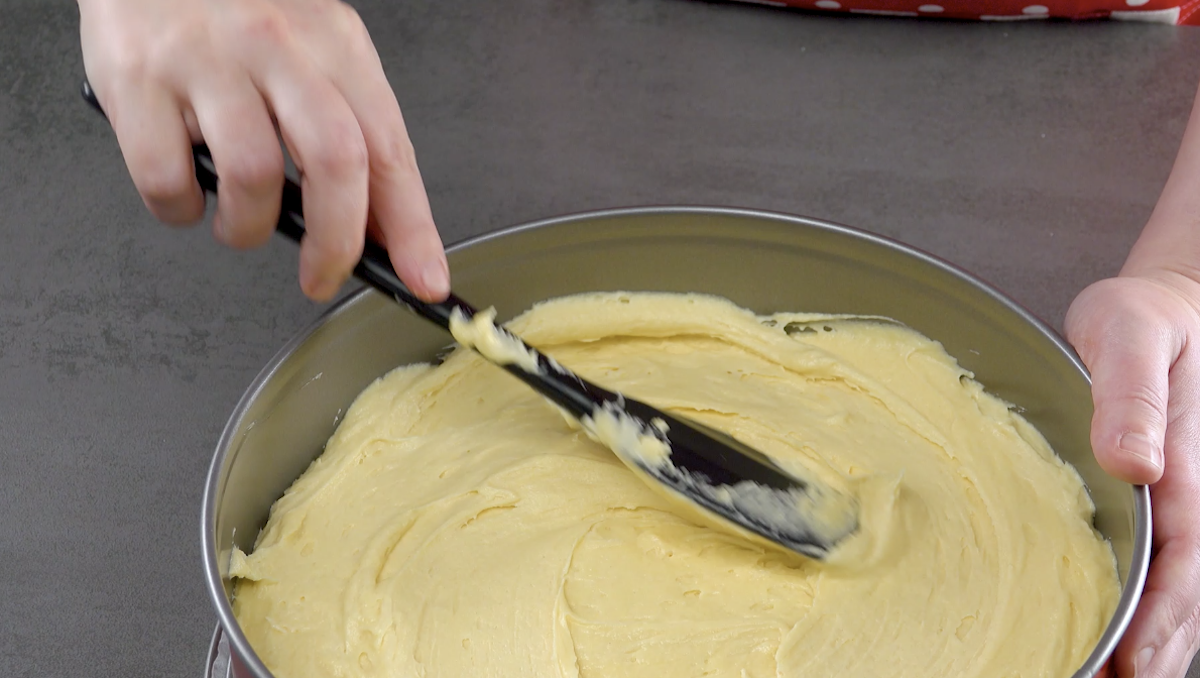 3.) Nun bereitest du den Teig zu. Schlage die Eier mit dem Zucker schaumig. Vermische in einer Schüssel Mehl, Backpulver und Salz miteinander und gib alles zu den schaumigen Eiern hinzu. Zum Schluss rührst du weiche Butter ein. Gieße den Teig ebenfalls in die Kuchenform. Streiche die Oberfläche mit einem Teigschaber platt.