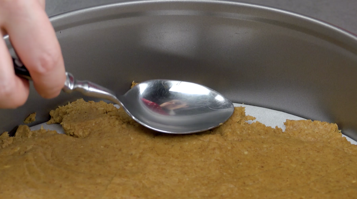 2.) Lege eine Kuchenform mit Backpapier aus und fette den Rand ein. Verteile die Keksmasse auf dem Boden der Form und drücke sie mit einem Löffel platt.