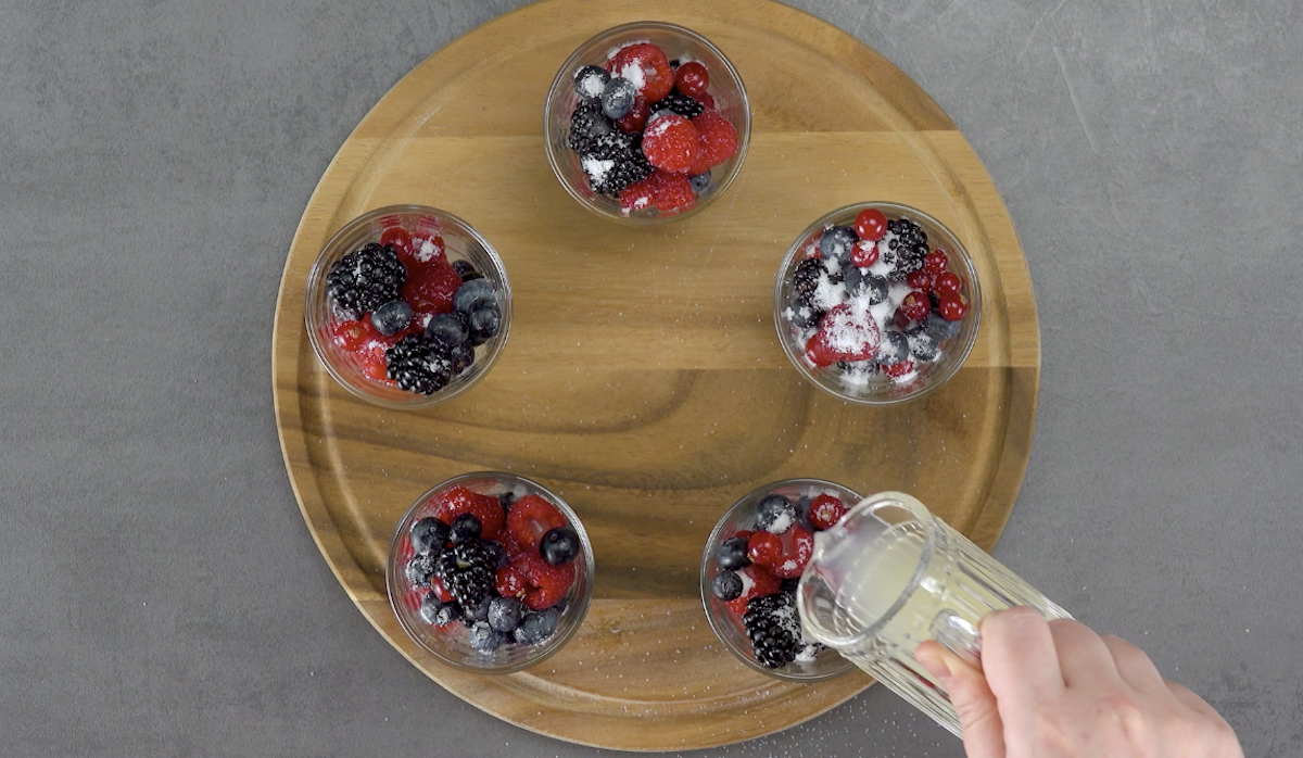 4.) Fette die fünf Gläser mit etwas Öl ein. Befülle alle Gläser mit einer bunten Beerenmischung und gib Zucker und Zitronensaft hinzu.