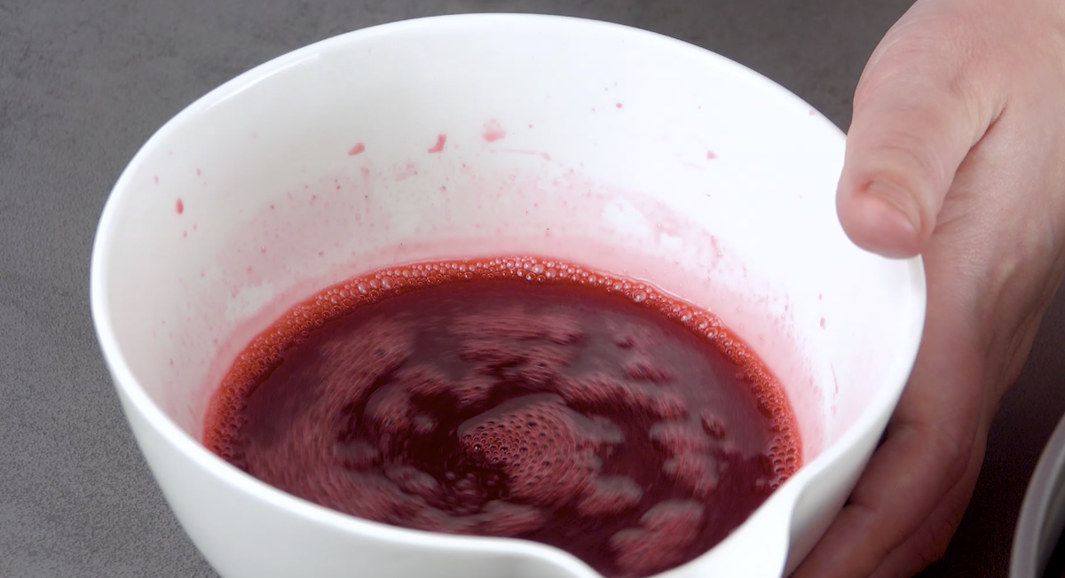 6.) Entferne nach dem Backen die Gläser aus dem Kuchen. Gieße den ausgetretenen Saft aus den Gläsern durch ein Sieb in eine Schüssel. (Es sollten mindestens 500 ml Saft sein. Bei Bedarf kannst du die Flüssigkeit auch mit warmem Wasser oder Kirschsaft auffüllen). Gib zu der Flüssigkeit das Götterspeise-Pulver hinzu und verrühre alles ordentlich.