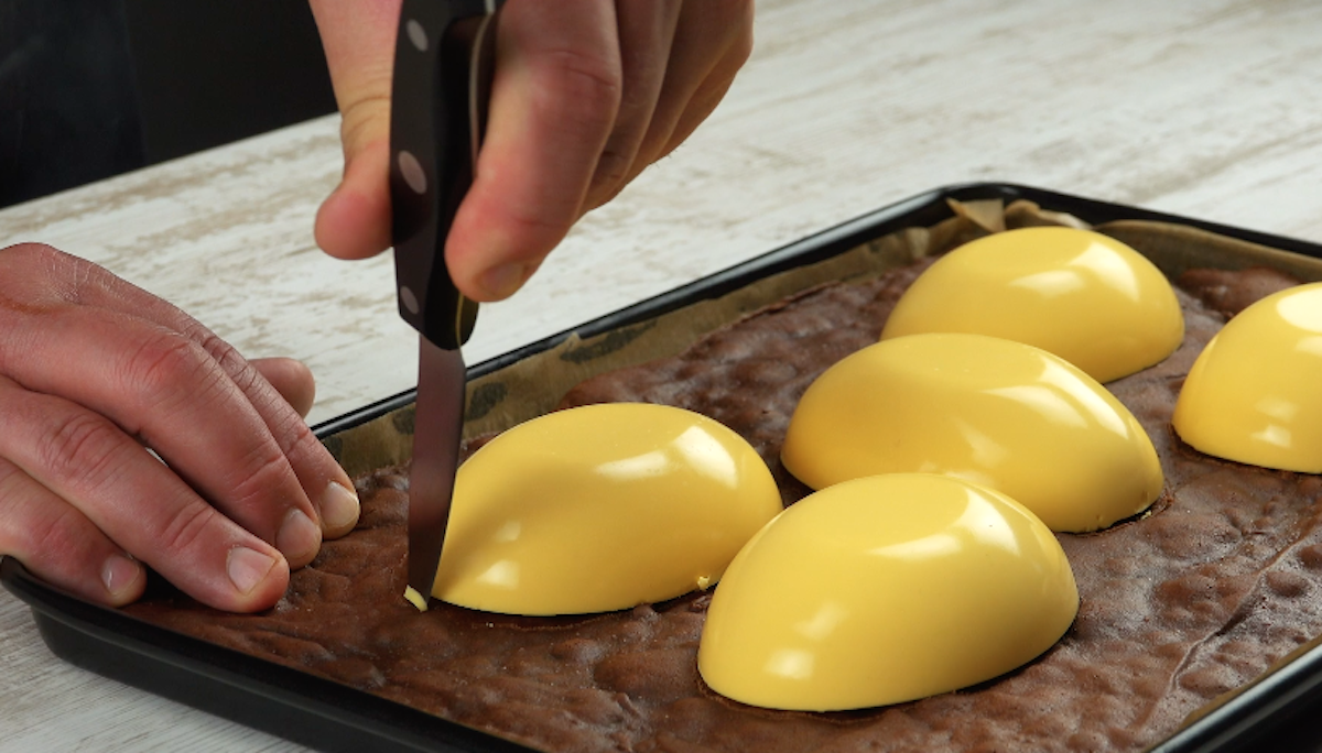 4. Drücke danach die hart gewordene Frischkäsecreme vorsichtig aus der Silikonform und lege sie auf den gebackenen Schokoboden. Stich mit einem Messer den Schokoboden mithilfe der Frischkäse-Eier als Schablone aus.