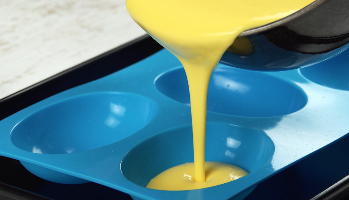 3. Erwärme Sahne in einem Topf und gib Honig, Safran und zuvor eingeweichte Gelatine hinzu. Vermische alles miteinander und hebe die nun gelbe Sahnemischung vorsichtig unter den Frischkäse. Befülle die Silikonform mit der fertigen Frischkäsecreme. Stelle die Form für mindestens 4 Stunden in den Kühlschrank.