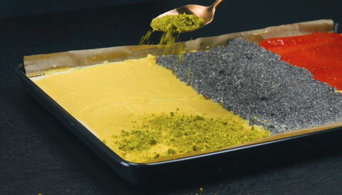 7. Verteile den Vanillepudding auf dem abgekühlten Boden. Gib dann auf jeweils ein Teigdrittel das Himbeermus, die Mohncreme und die kleingehackten Pistazien.