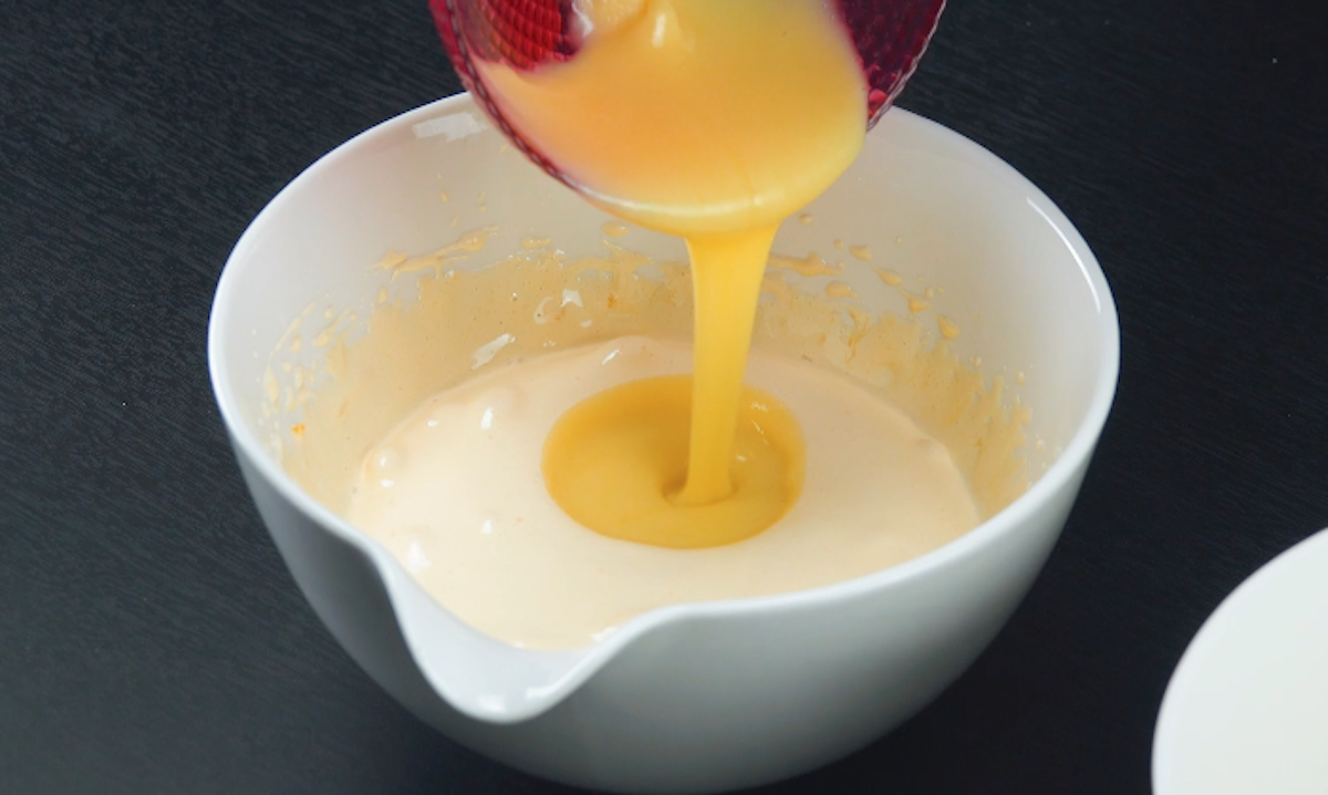 3. Nun widmest du dich dem Biskuitteig. Schmilz Butter mit weißer Schokolade. Trenne die Eier und schlage die Eigelbe mit dem Zucker cremig. Rühre dann die Schoko-Butter-Mischung unter.
