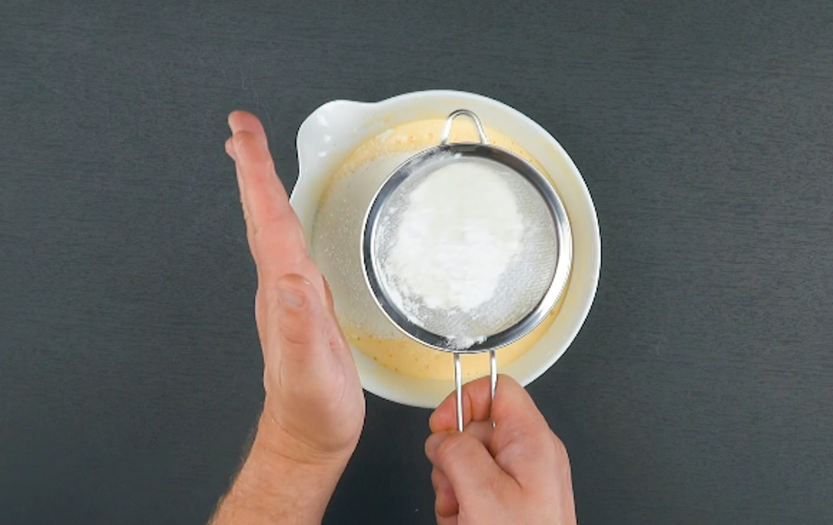 4. Schlage die Eiweiße steif und hebe sie vorsichtig unter den Rest. Mische nun Mehl mit Salz und Stärke und siebe alles noch in die Schüssel hinzu.