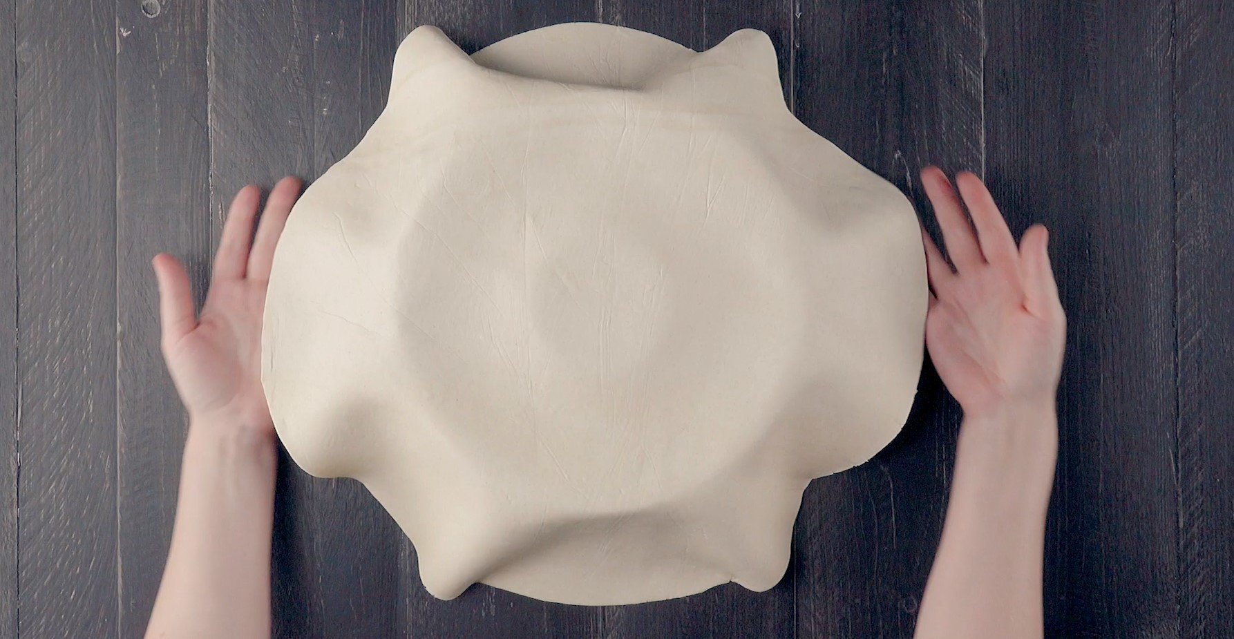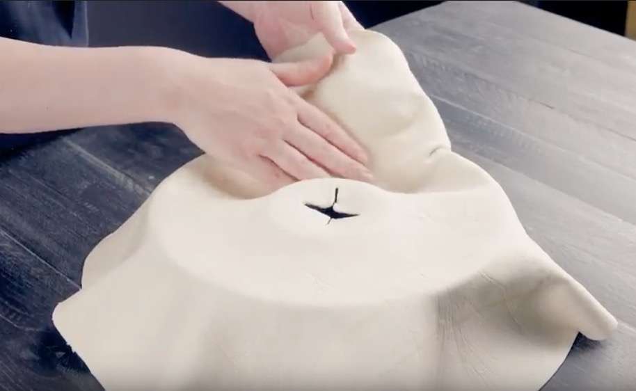 1.) Lege die Blätterteigplatte auf eine Gugelhupfform. Schneide dann in der Mitte ein Kreuz hinein und drücke den Teig anschließend innen leicht an die Form, bis sie ganz damit ausgekleidet ist.